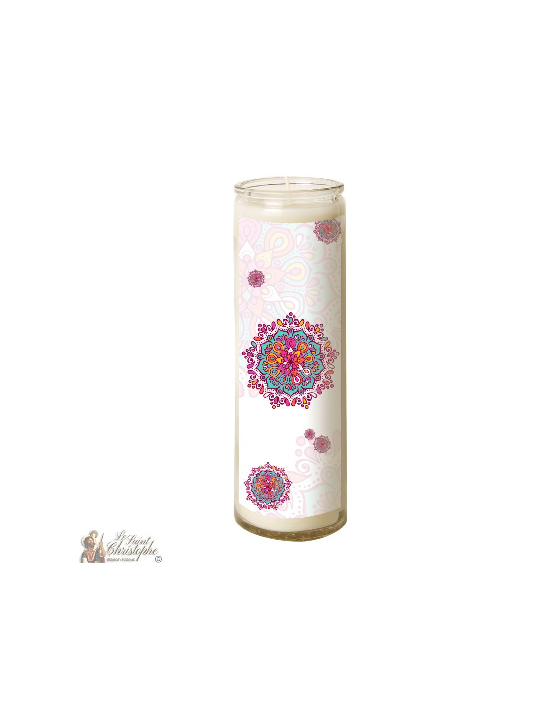 Mit einer wunderschönen Illustration von rosa und orangefarbenen Mandalas als Dekoration kann diese Kerze zum Gebet, zur Meditation, zur Dekoration oder auch zur Esoterik verwendet werden.