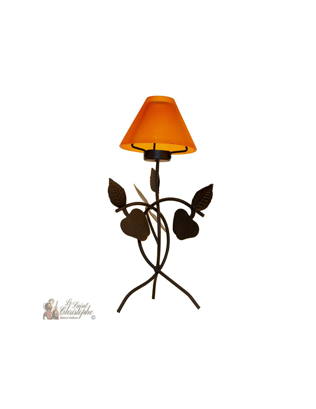 Dieser Kerzenhalter ist aus Schmiedeeisen mit einem Glasschirm gefertigt. Der Orangeton ist schwarzbraun und kontrastiert sehr gut mit dem orangefarbenen Glasschirm. Das Ganze bildet mit der natürlichen Seite mit den Metallblättern der Äpfel ein schönes Dekorationsobjekt.