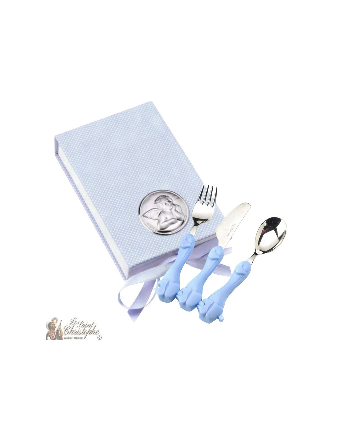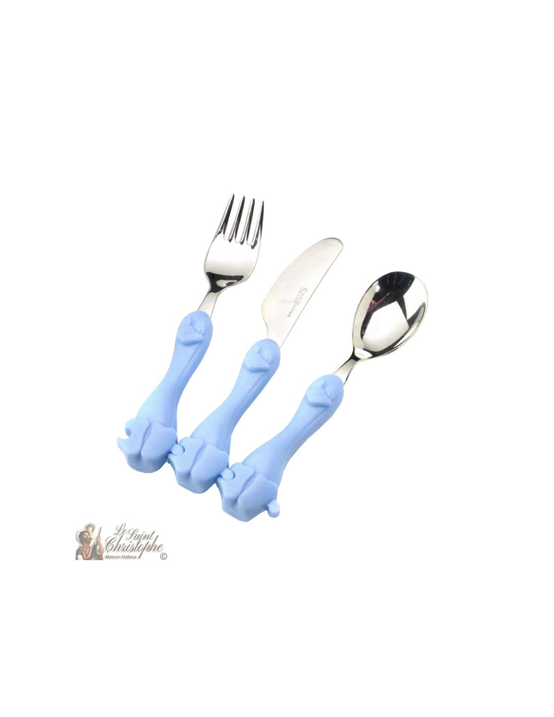 Set aus drei Silberbesteckteilen (Gabel, Löffel und Messer). Der Griff hat die Form von kleinen Pinguinen, die zusammengesteckt werden können.