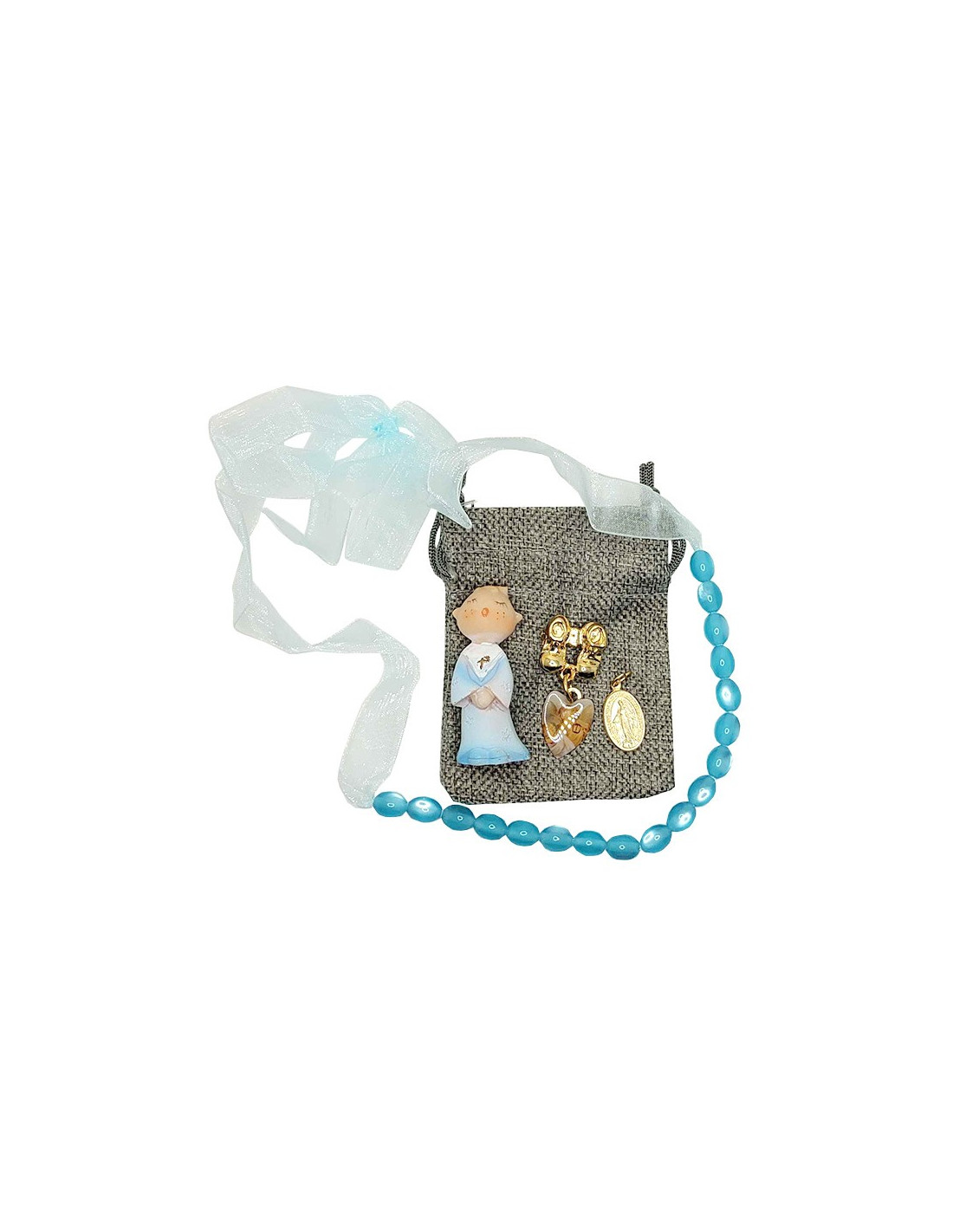 Dieses Täschchen ist ideal als Geschenk zur Geburt oder Taufe. Die blaue Tasche enthält eine blaue Kinderglücksfigur, eine vergoldete Brosche in Form von kleinen Schuhen und einem Herz mit dem Bild eines Schutzengels sowie eine versilberte und blau emaillierte Medaille der Jungfrau Maria und der Erscheinung von Lourdes.