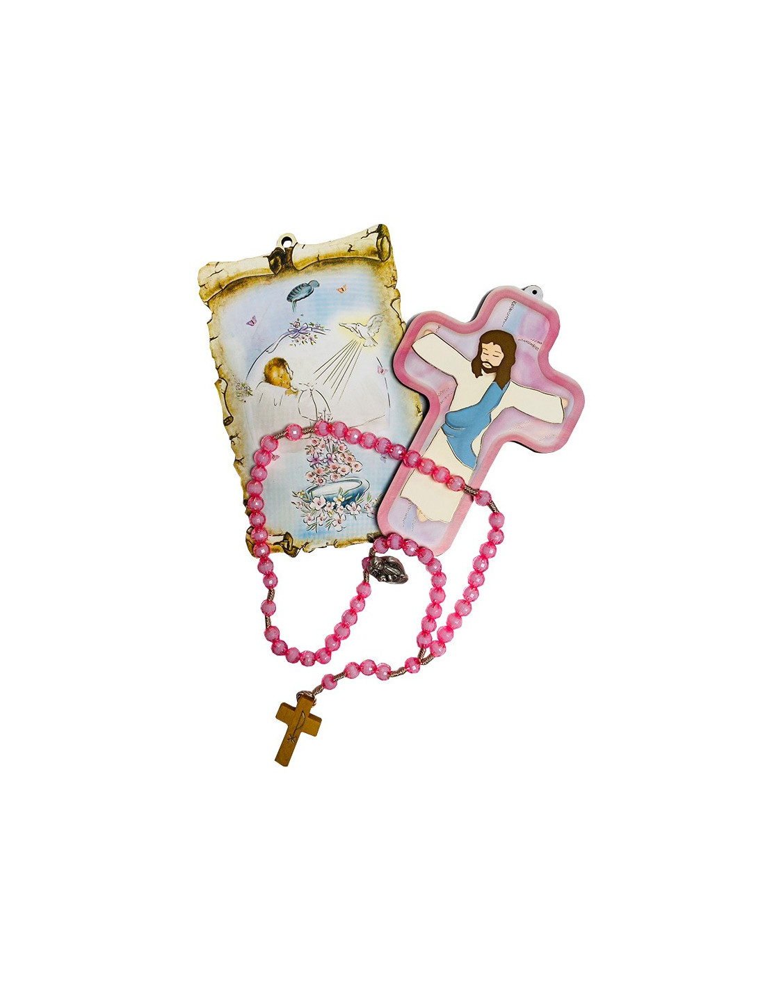 Geburtsgeschenke zum Schutz des Neugeborenen. Dieses Set besteht aus einer Wandplatte, die ein Pergament nachahmt und eine Taufe darstellt, einer rosafarbenen Wandplatte mit Jesus Christus, einem rosafarbenen Pax-Rosenkranz und einem Schutzengel-Pin.