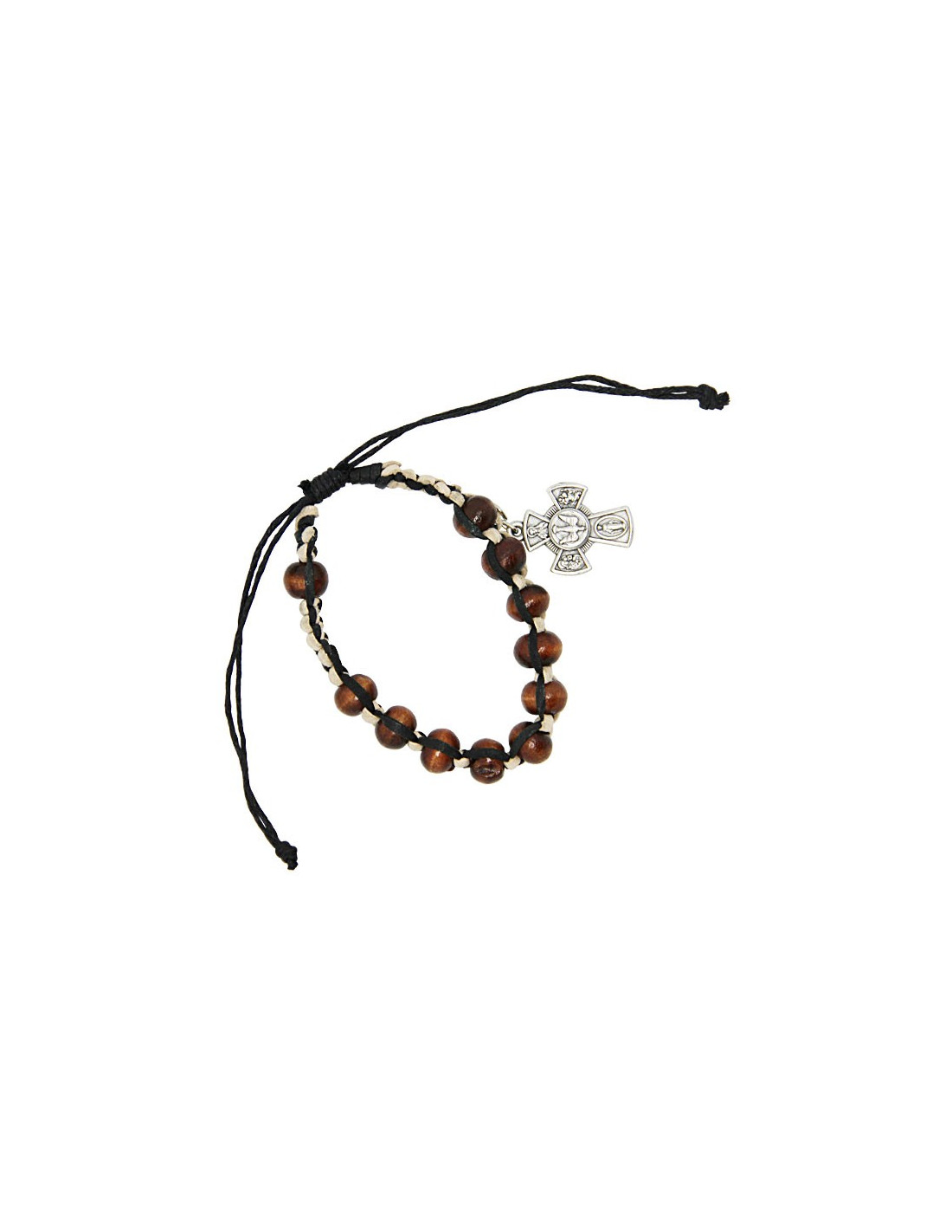 Das neue Armband aus beigen und schwarzen Lederschnüren und braunen Holzperlen ist ein elegantes Schmuckstück mit einem natürlichen und böhmischen Touch. Es ist mit einem versilberten Kreuz geschmückt, auf dem die Figuren der Heiligen Beschützer eingemeißelt sind. Die Anzahl der Perlen erlaubt es auch, dieses Schmuckstück als Zehner-Rosenkranz für Gebete zu verwenden.