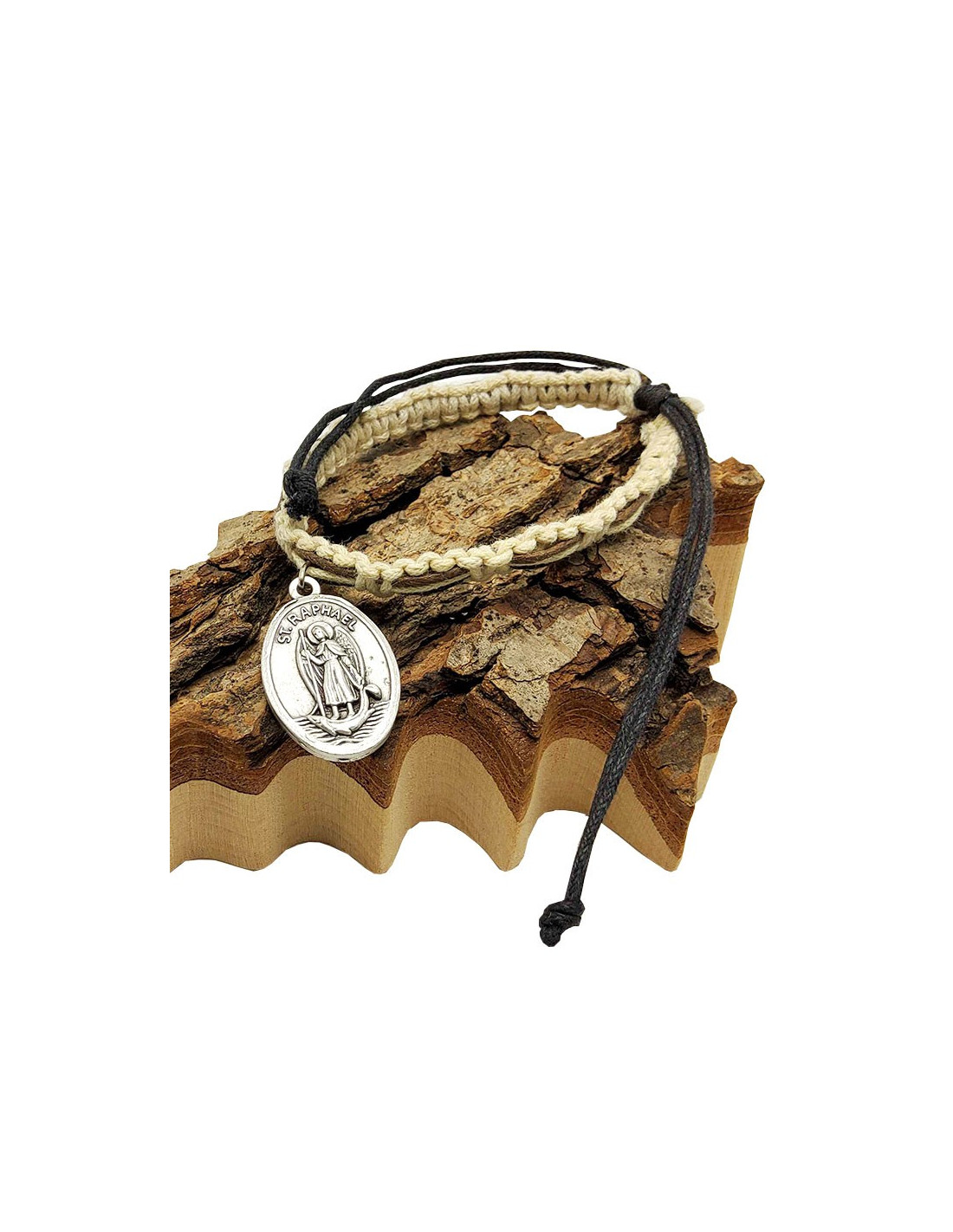 Armband aus geflochtenen Kordeln in natürlichen Farben mit einer Phantasiemedaille aus Metall des Erzengels Michael und des Erzengels Raphael. Die Kordeln sind in den Farben Weiß, Schwarz und Braun gehalten. Es ist eine natürliche, fast böhmische Mischung, die sich leicht mit allem kombinieren lässt.