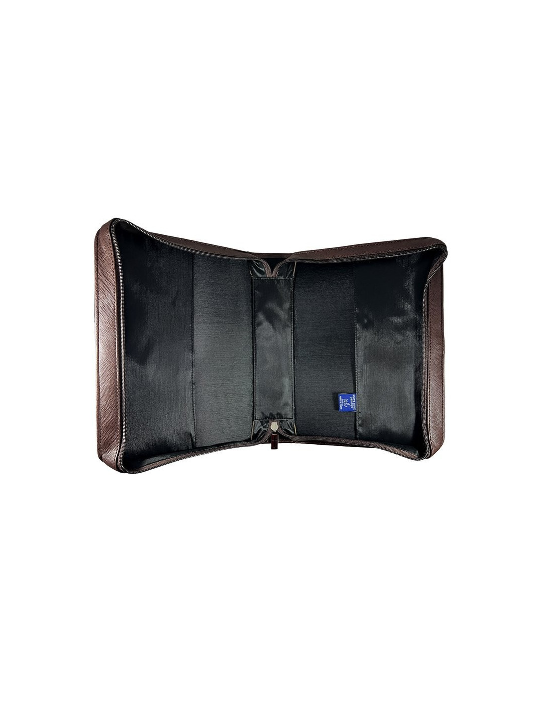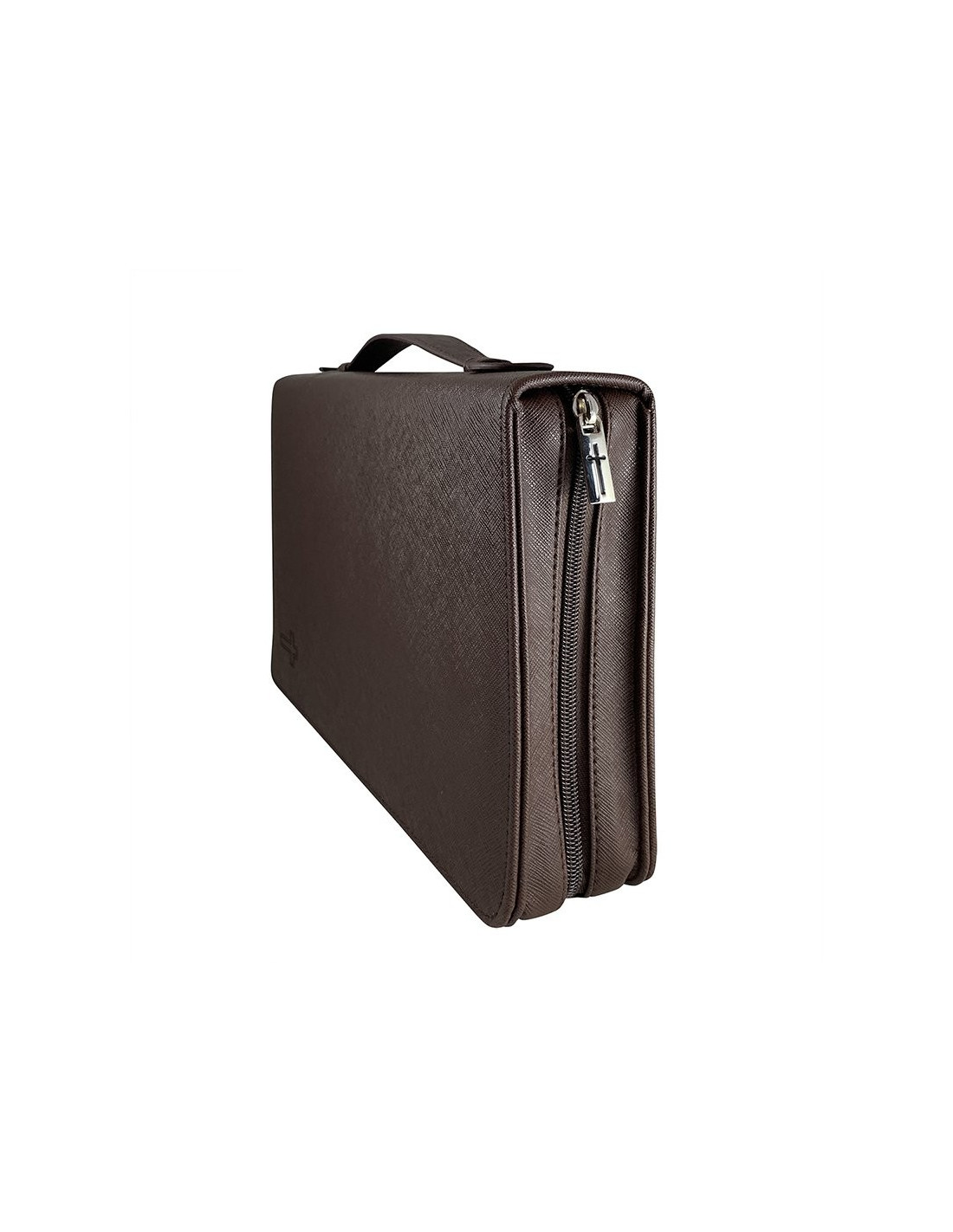 Diese Hülle hat einen Griff auf der Rückseite, damit Sie sie überall hin mitnehmen können. Die Außenseite besteht aus strukturiertem braunem Kunstleder, auf dessen Vorderseite das Kreuzsymbol eingraviert ist. Die Hülle wird mit einem Reißverschluss geschlossen, der ebenfalls mit einem Kreuz verziert ist.