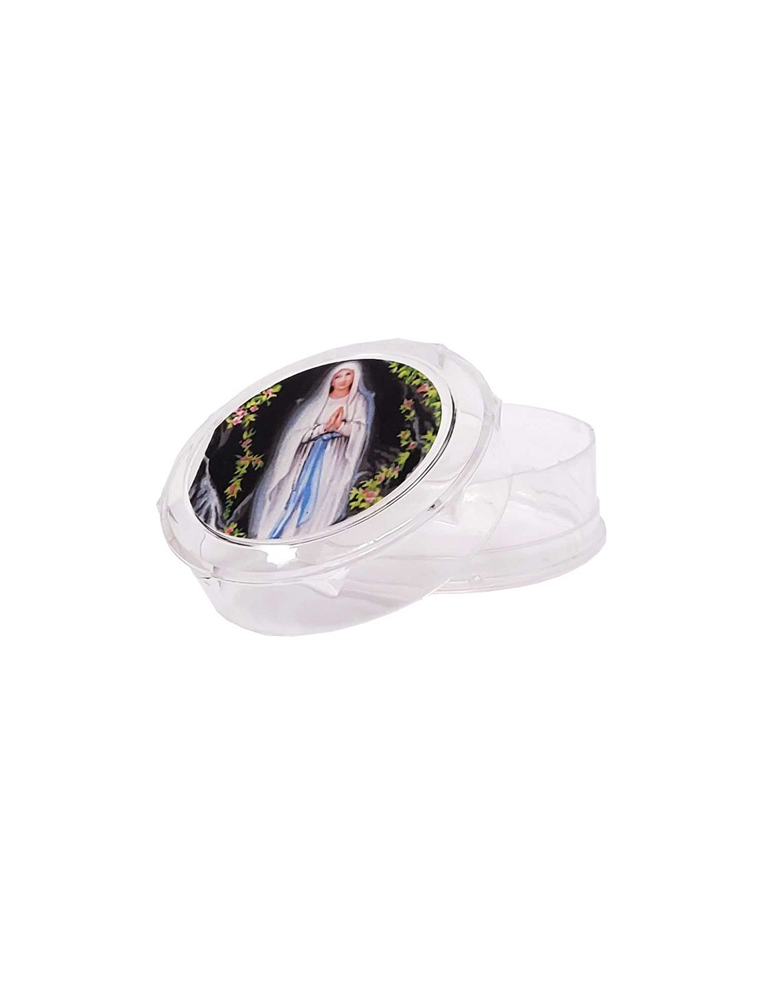 Transparenter Pyx aus Kunststoff, der einen Rosenkranz, eine Zehn, Hostien aufnehmen kann... Es ist ein sehr schönes Souvenirgeschenk für eine Kommunion, eine Taufe, eine Hochzeit oder als Andenken an eine Wallfahrt.