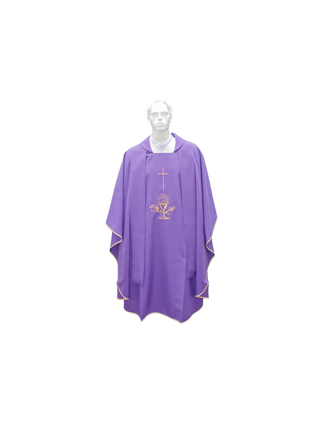 Hellviolette Kasel für Priester mit einer Stola, die mit Goldfaden mit einem einfachen und schlichten Kreuz bestickt ist, das über der heiligen Hostie und dem Kelch liegt, der von einer Weintraube und einer Weizenähre umgeben ist. Die Kasel ist mit einem goldenen Rand verziert. Die Stickerei ist beidseitig.