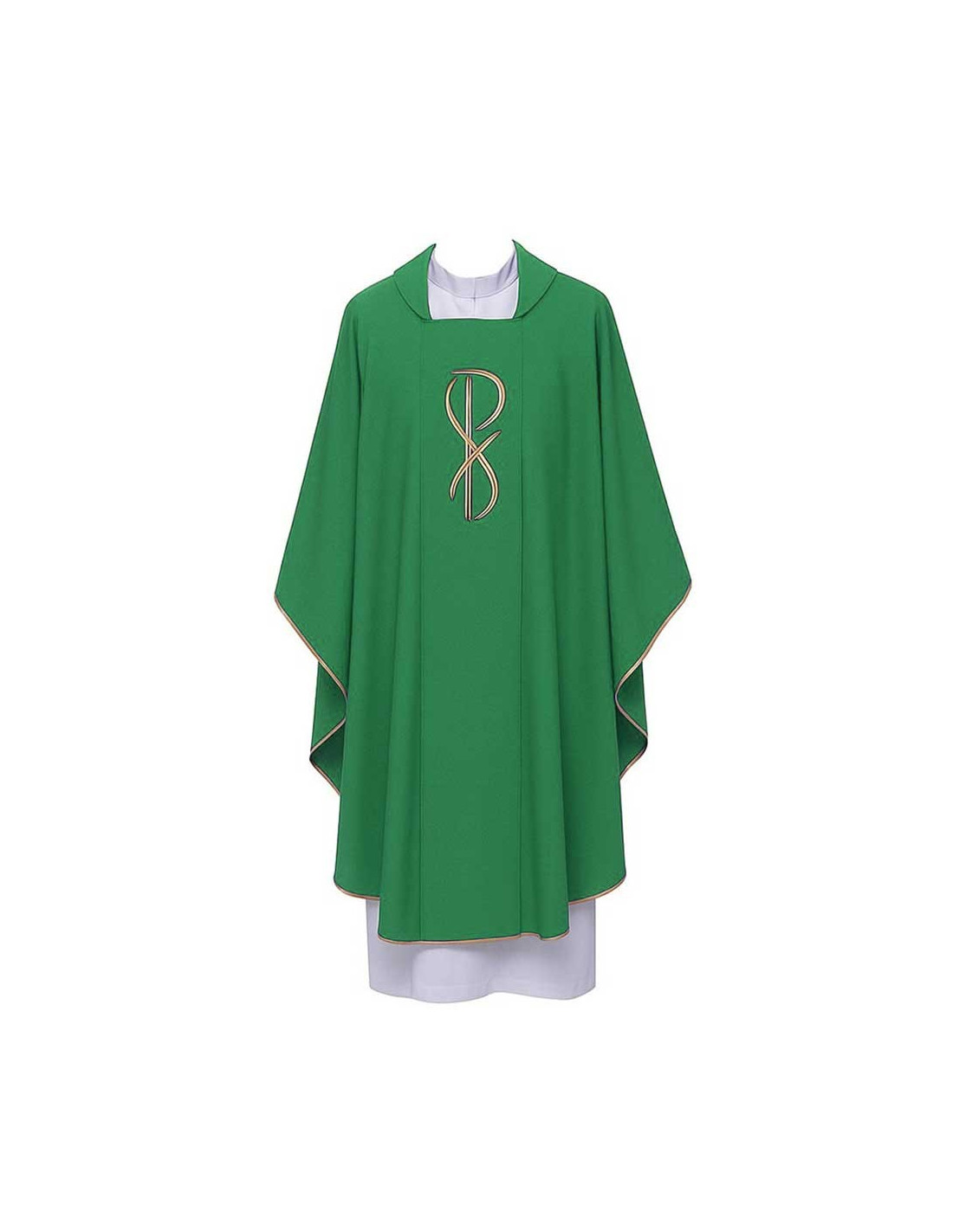 Smaragdgrüne Priesterkasel mit goldener PAX-Symbol-Stola. Die Kasel ist mit einer Goldbordüre verziert. Die Stickerei ist beidseitig, d. h. auf Vorder- und Rückseite, angebracht.
