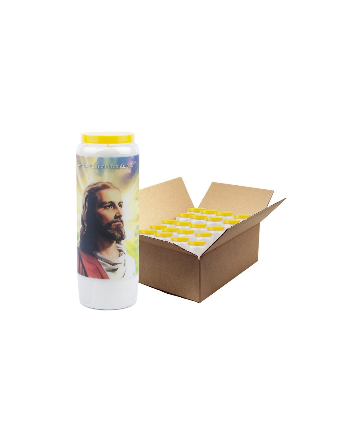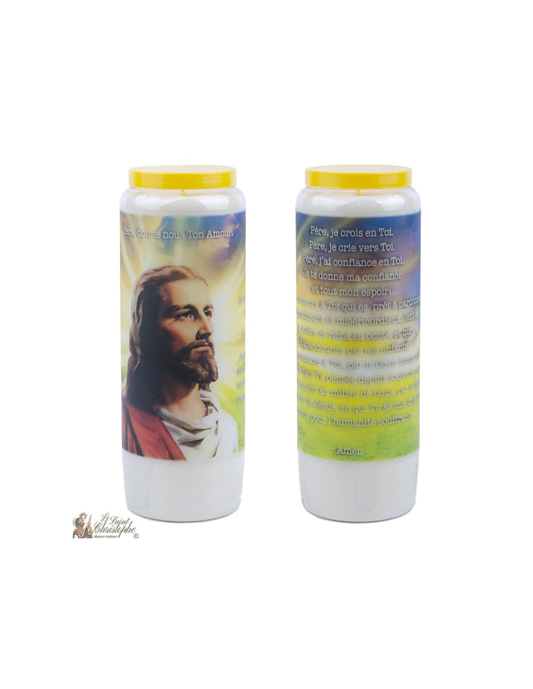 Schachtel mit 20 Novenekerzen mit dem Bild von Jesus Christus auf der Vorderseite und dem Gebet „Vater, ich glaube an dich“ auf der Rückseite.