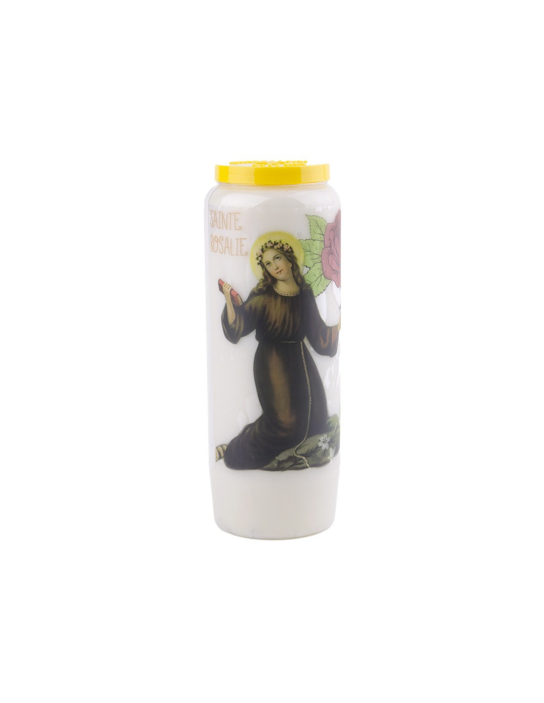 Schachtel mit 20 weißen Novenekerzen mit dem Bild der Heiligen Rosalie und einem Gebet auf der Rückseite.