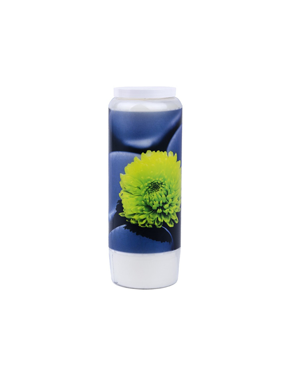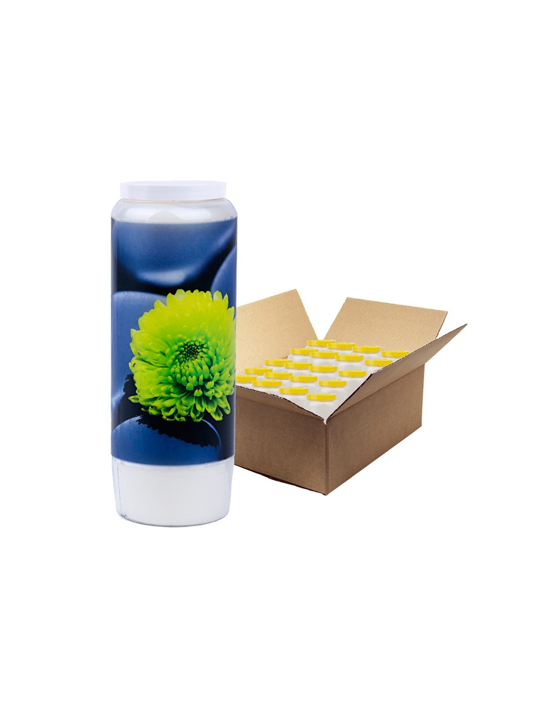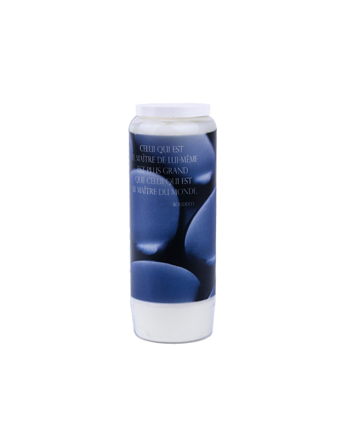 Schachtel mit 20 Novenekerzen mit einem Zen-Bild aus polierten Steinen und einer Blume auf der Vorderseite und einem Zitat von Buddha auf der Rückseite.