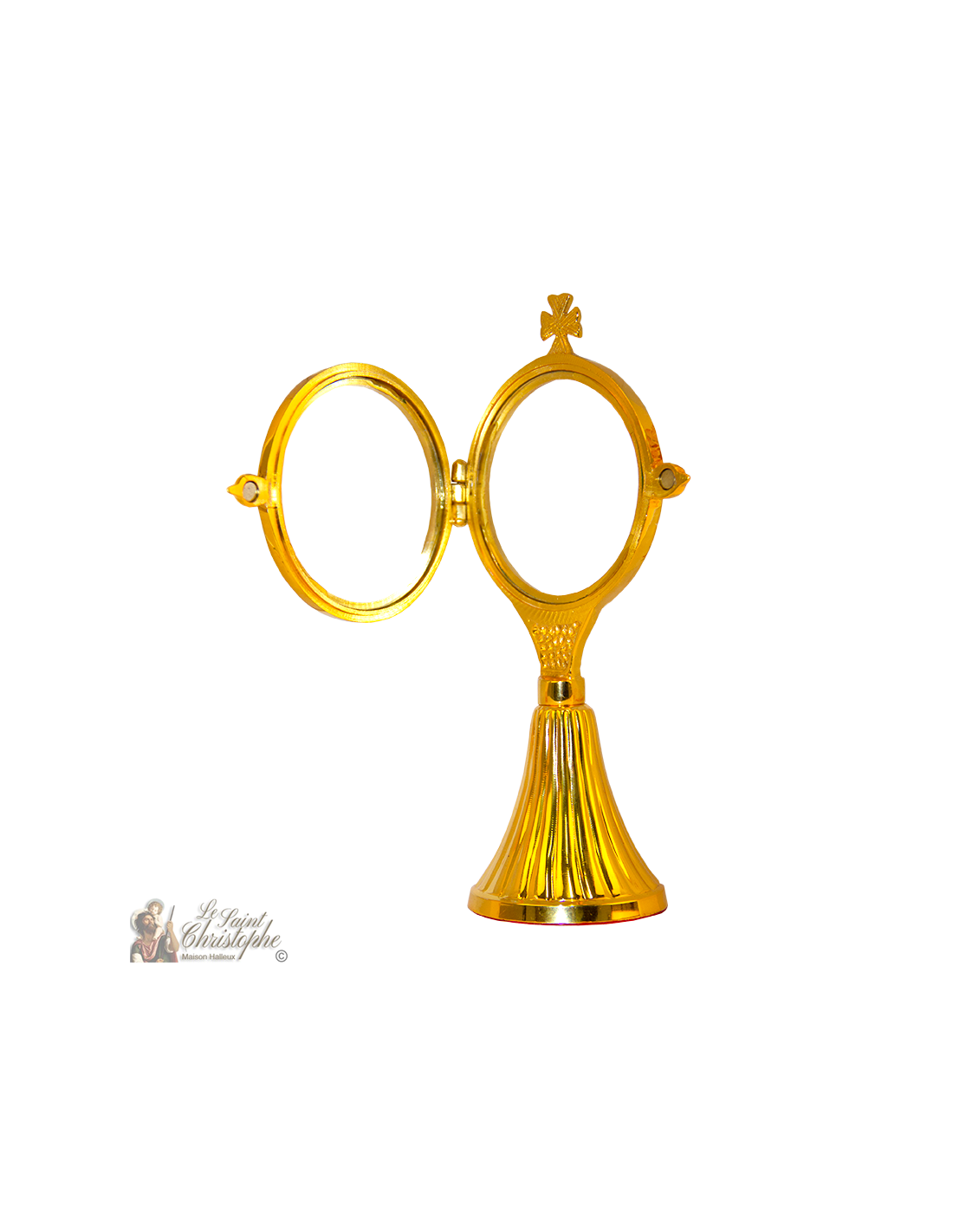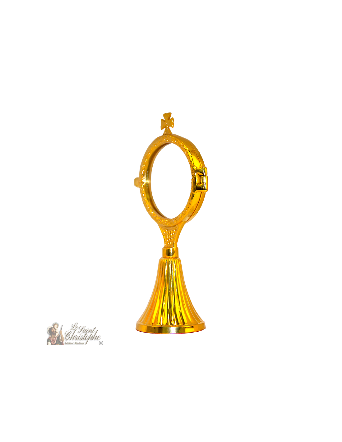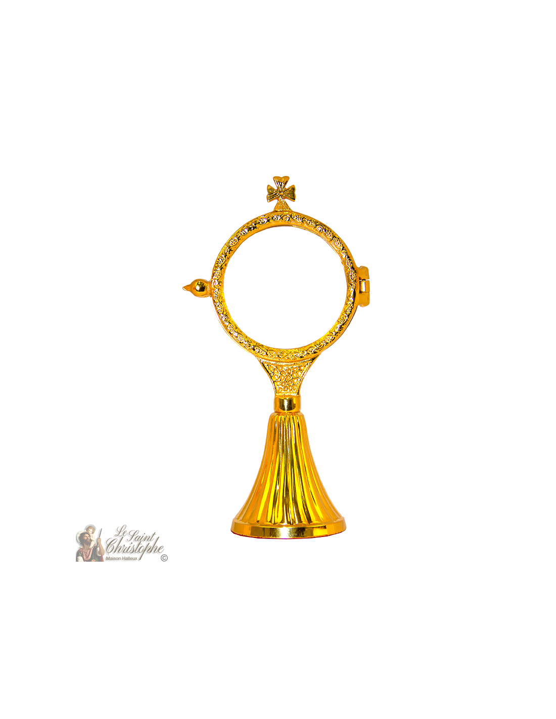 Monstranz für den Gottesdienst, überragt von einem Kreuz und mit einer Lunula, die zart mit Arabesken verziert ist. Von schöner goldener Farbe und mit einem mit rotem Samt überzogenen Fuß, ist er vollständig von Hand gefertigt.