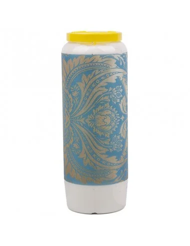 Weiße oder farbige Novenenkerze mit einem blauen und gelben Barockbild rund um die Kerze.