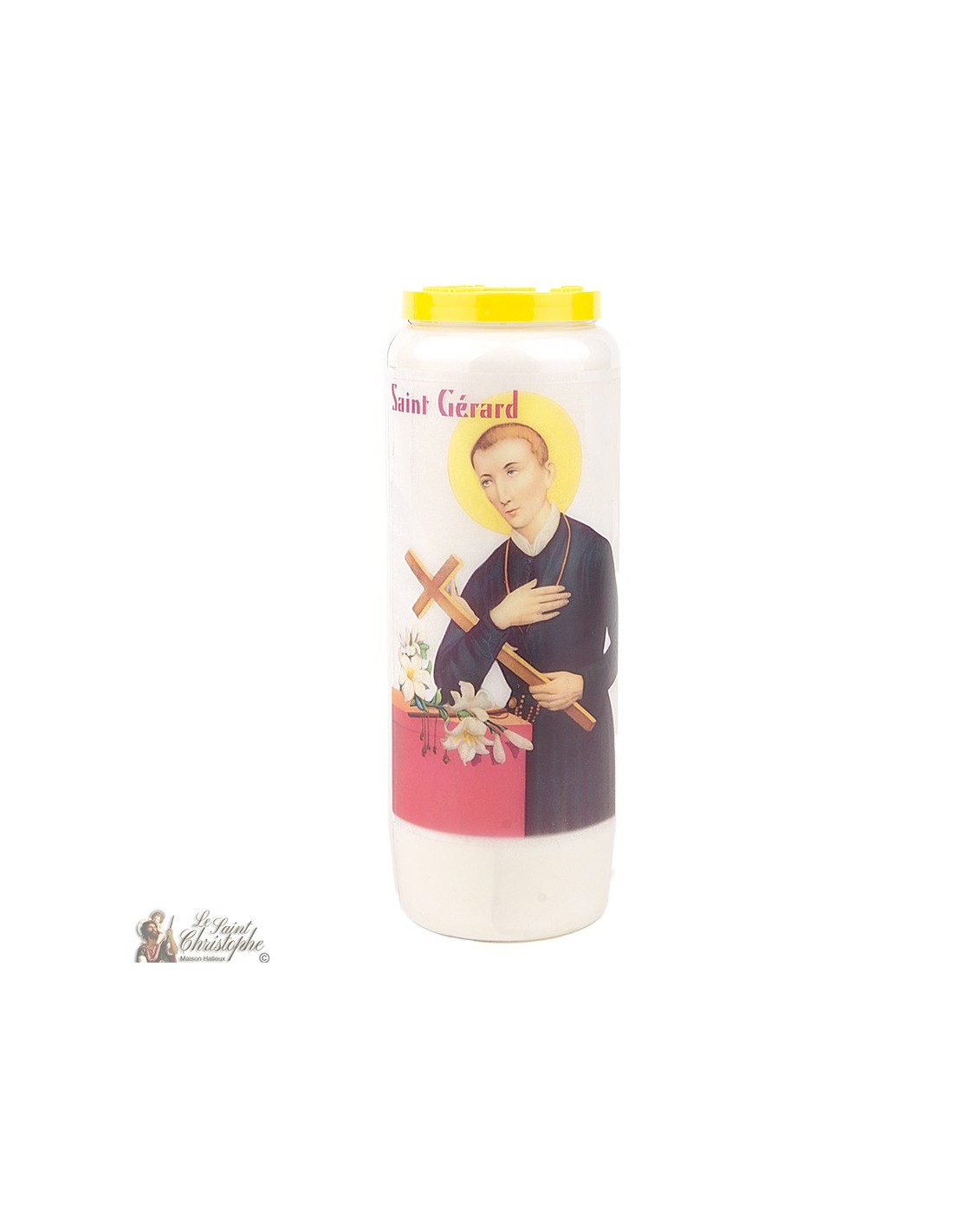 Weiße Novenkerze mit dem Bild des Heiligen Gérard und einem ihm gewidmeten Gebet.