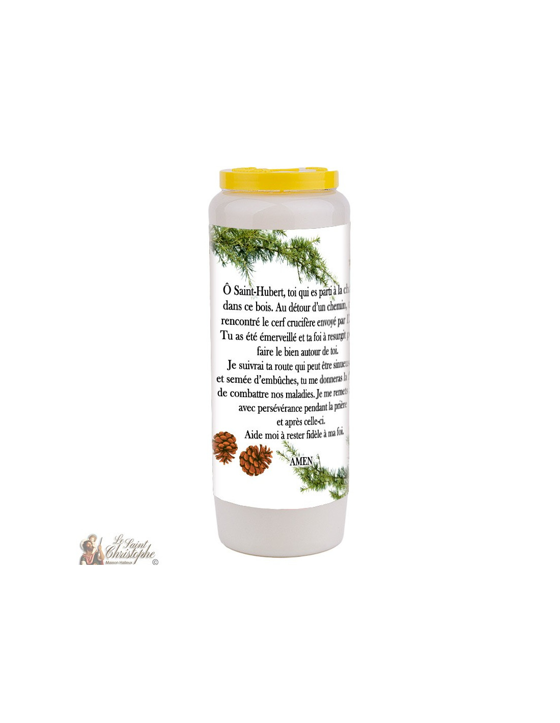 Gemüse-Novenkerze mit einem Bild des Heiligen Hubertus und Gebet auf der Rückseite in der Sprache Ihrer Wahl