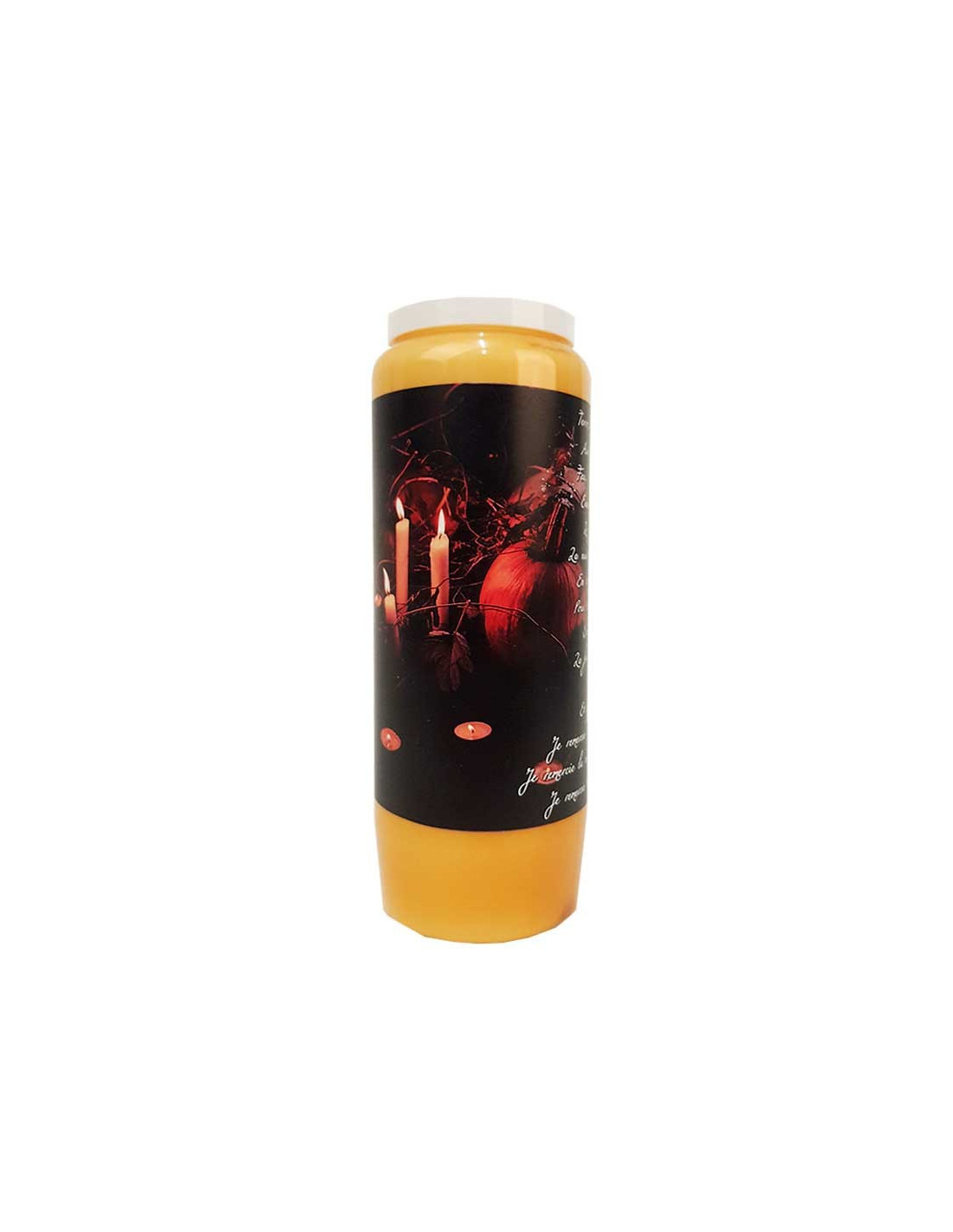 Orangefarbene Novenakerze mit einem Bild von Kürbissen und Kerzen sowie einem Gebet für Samhain.