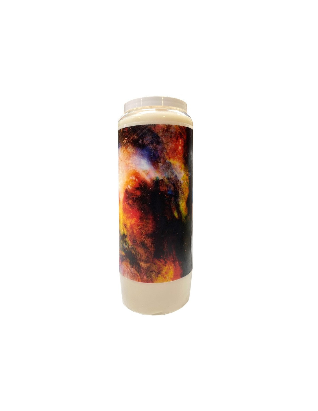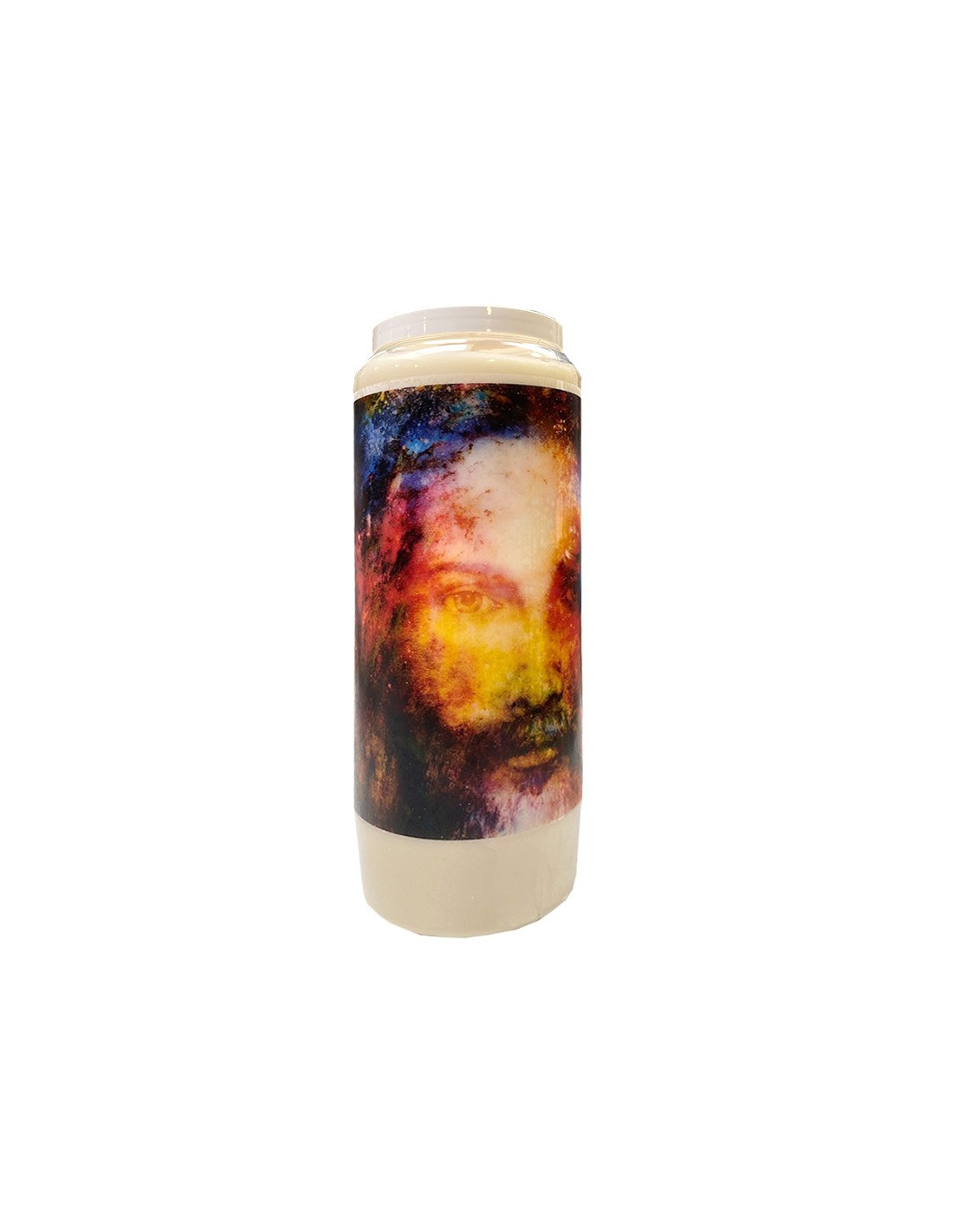 Pflanzliche, nach Sandelholz duftende Novenenkerze mit einem Bild von Jesus Christus in einem modernen, farbenfrohen Gemälde. Die Kombination von Sandelholz und Jesus verleiht der Luft eine reinigende Wirkung und hilft bei der Heilung.