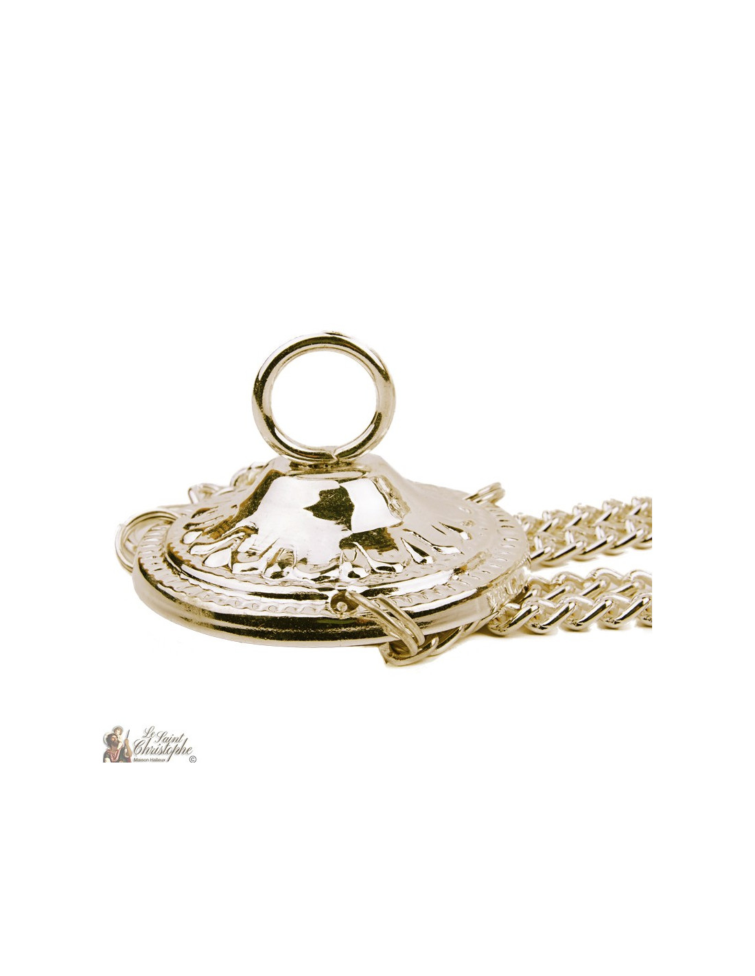Dieses vergoldete Hängegefäß ist mit einem schönen Pflanzenfries auf der Oberfläche graviert und wird von einem reich verzierten Kreuz gekrönt. Der Deckel liegt gut in der Hand, auch dank des Kreuzes und der Hopfenform, die ihn noch größer macht. Die Löcher sind diskret in die weißen Flächen des Frieses geschnitten und verleihen ihm mehr Relief. Das Räuchergefäß enthält auch ein Gitter zum Ablegen der Räucherstäbchen und -körner. Die langen Ketten ermöglichen es, ihn aufzuhängen.