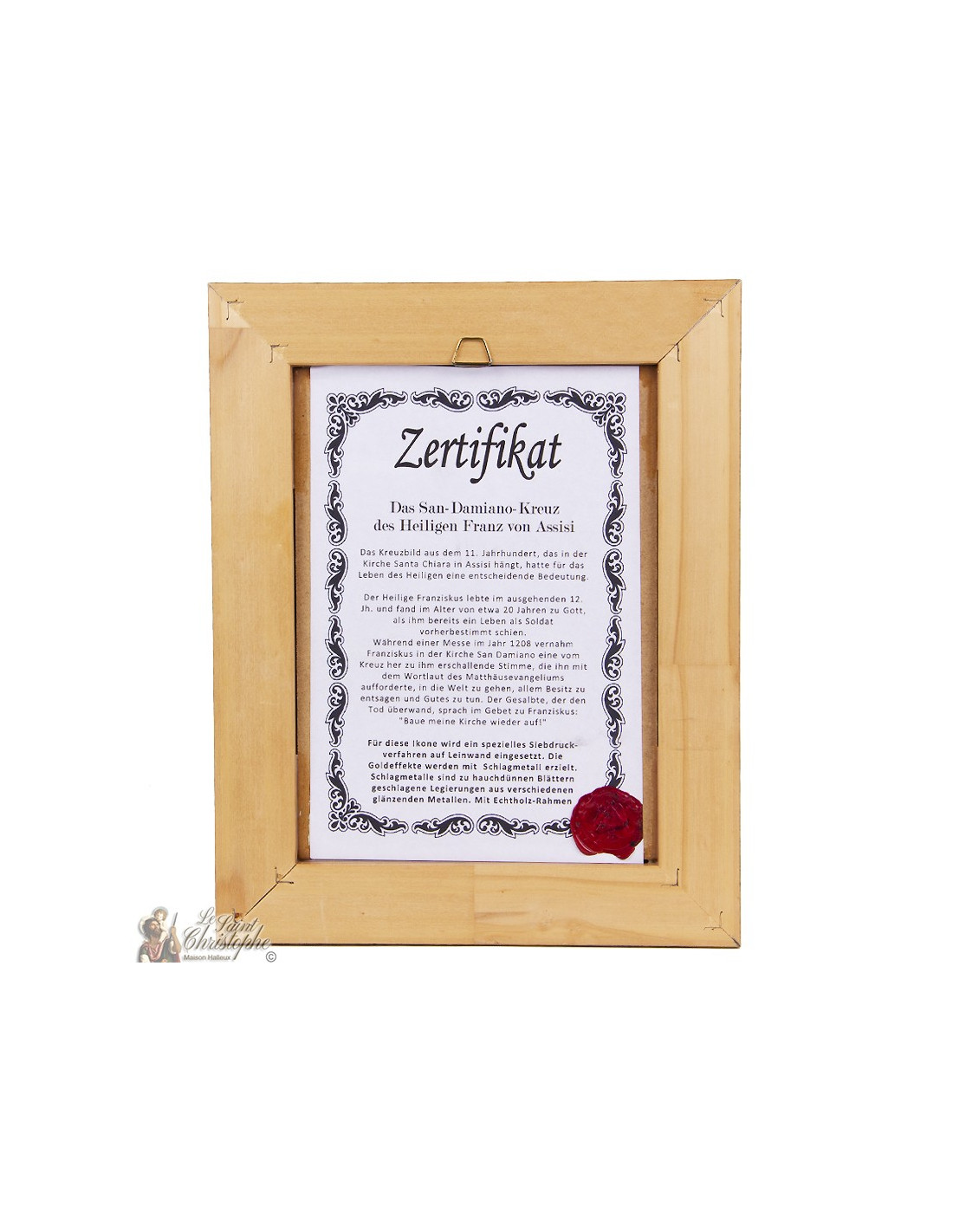 Ikone des Kruzifixes von San Damiano, mit antik wirkendem Rahmen und Garantiezertifikat auf der Rückseite.