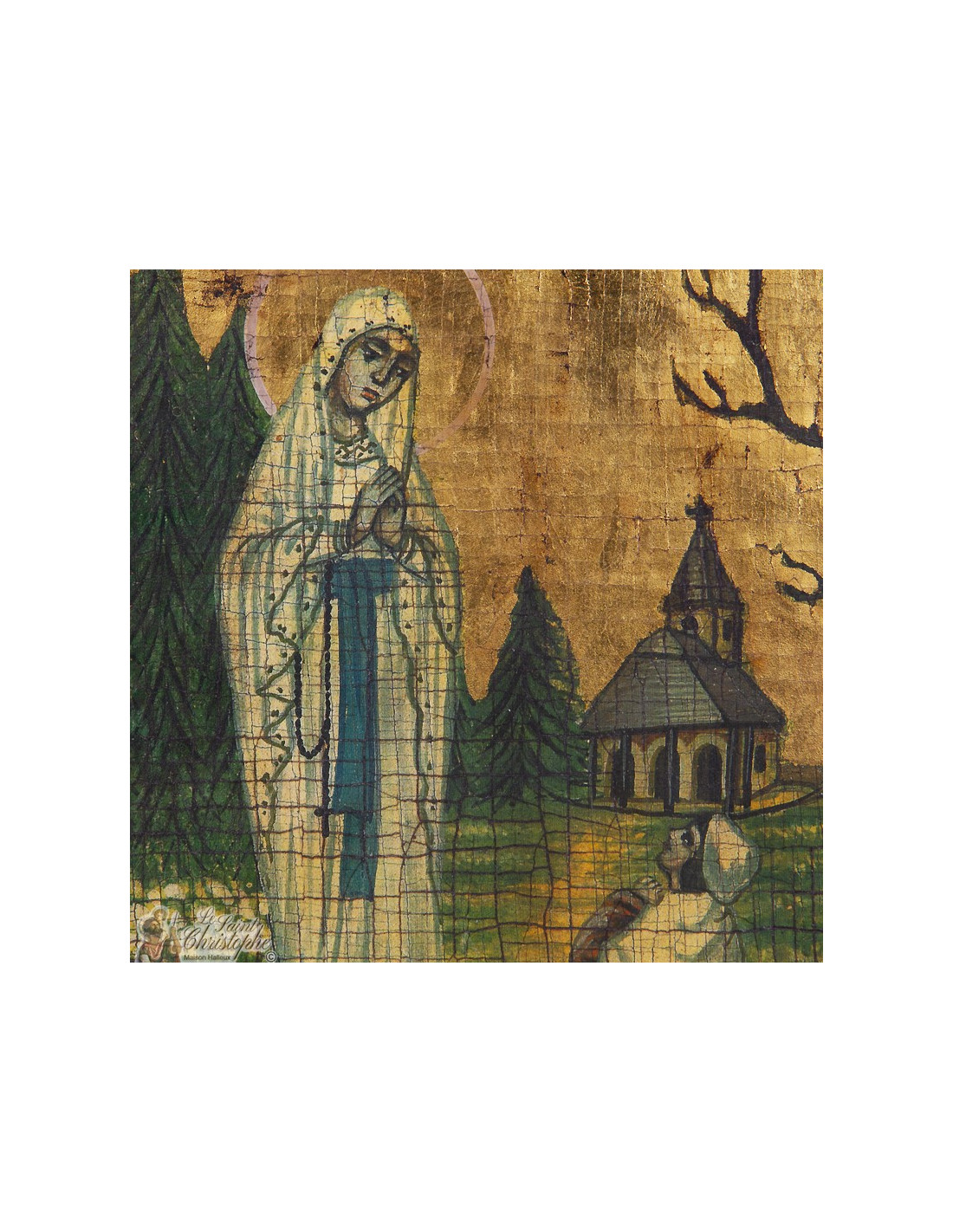 Ikone aus Banneux großes Modell. Diese handgemalte Ikone mit Vergoldung auf einem Holzständer stellt die Erscheinung der Heiligen Jungfrau der Armen von Banneux Notre-Dame dar, die vor der kleinen Mariette Beco erschienen ist. Sie ist ein großartiger religiöser Artikel für das Gebet und ein wunderbares Geschenk für Gläubige.