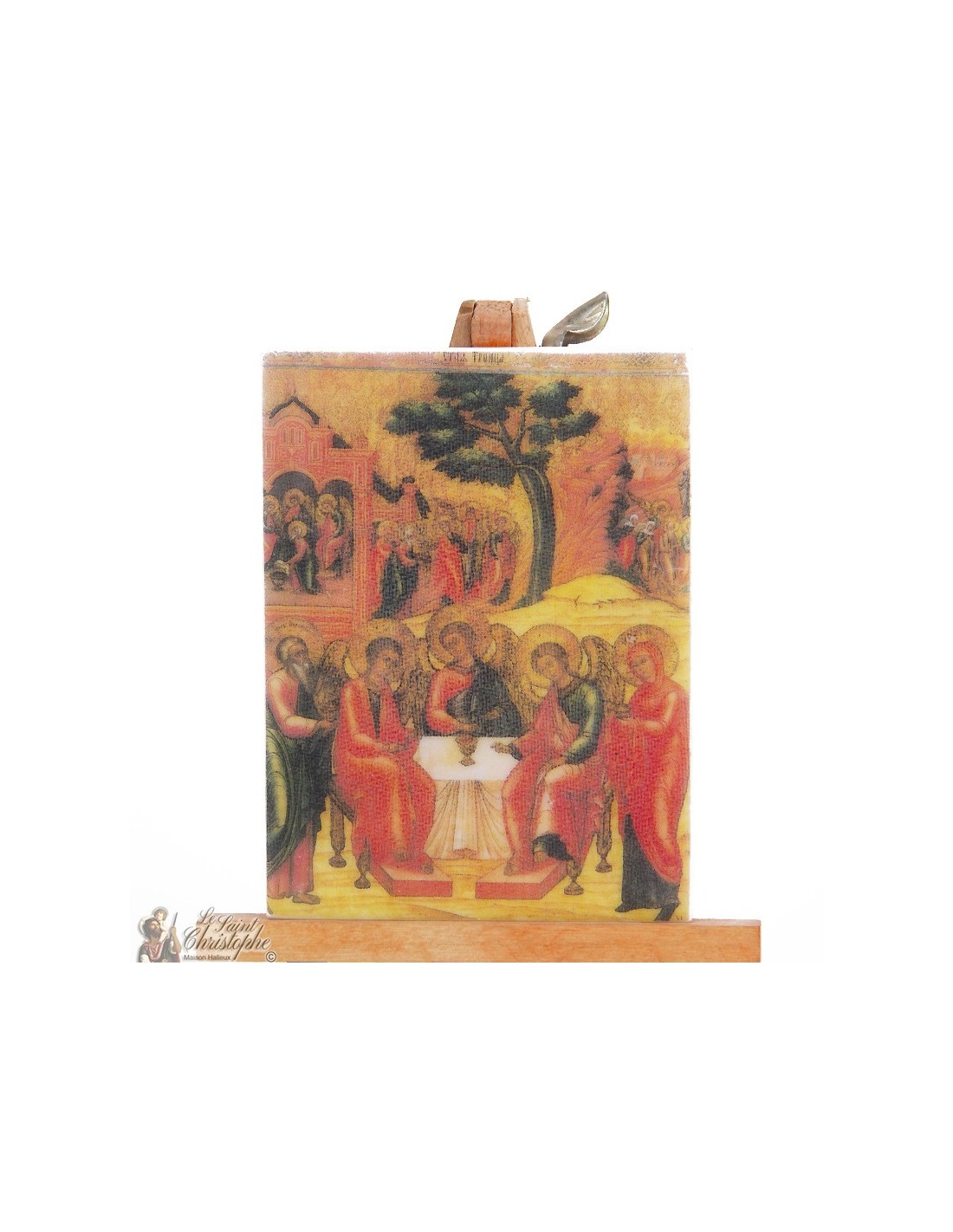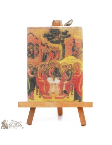 Kleine religiöse Ikone auf einer hölzernen Staffelei, getreue Wiedergabe einer heiligen Szene: die Heilige Dreifaltigkeit gemäß dem Alten Testament. Kompakt findet es seinen Platz auf einem persönlichen Altar, einem Nachttisch oder einem Schreibtisch. Ein wunderschönes Objekt des Glaubens und der Kontemplation.