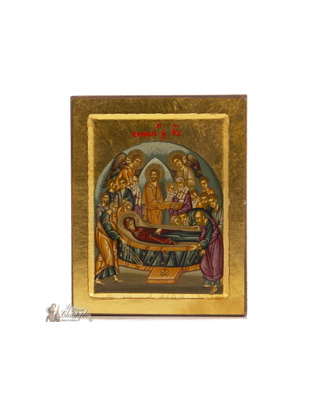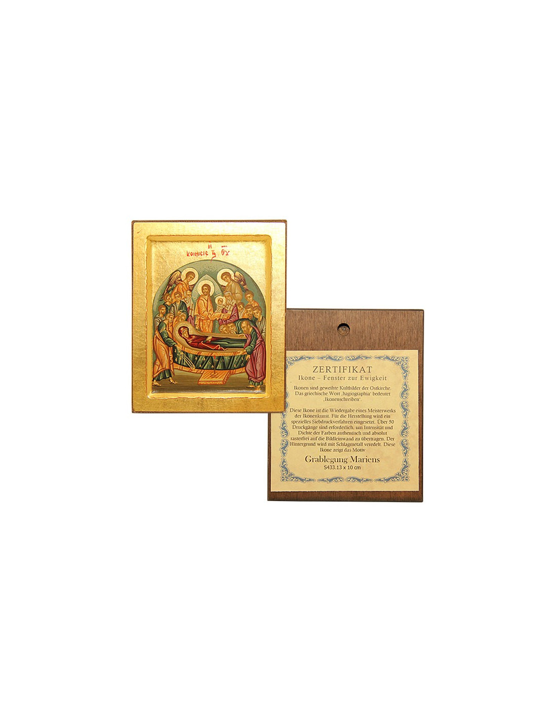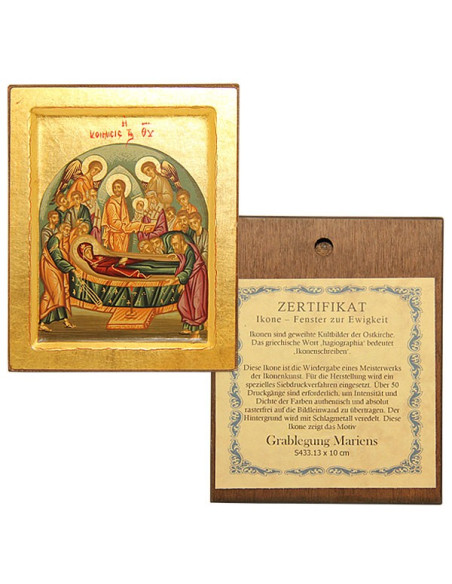 Diese 10 x 13 cm große orthodoxe Ikone zeigt die Himmelfahrt der Jungfrau Maria, auch Entschlafung genannt. Umgeben von den Aposteln und Engeln ruht Maria friedlich, während Christus ihre reine Seele willkommen heißt. Diese fein gemalte, mit Blattgold vergoldete Ikone verkörpert die Zärtlichkeit und den tiefen Glauben der ostchristlichen Tradition. Mit einem Echtheitszertifikat auf der Rückseite der Ikone versehen, lädt sie zum Gebet und zur Meditation über das Geheimnis des ewigen Lebens ein.