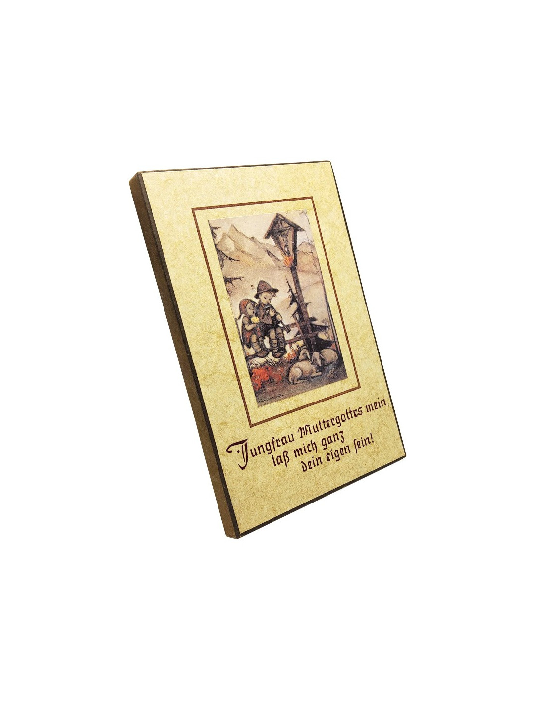 Diese religiöse Wandtafel aus Holz ist 10 cm breit, 15 cm hoch und 1 cm dick. Sie ist mit einer sanften, ländlichen Szene aus den Zeichnungen von M.J. Hummel illustriert: zwei betende Kinder vor einem Kalvarienberg in einer Berglandschaft mit herbstlichen Farben.