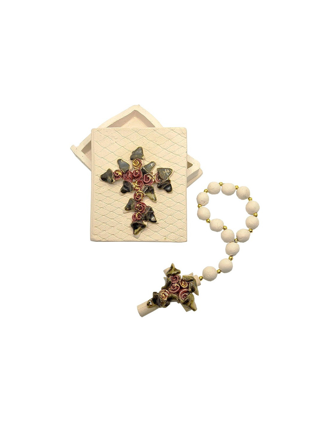 Dose und Zehner eines Rosenkranzes vollständig von Hand aus Terrakotta gefertigt. Die Dose hat die Form einer Bibel und ist mit einem aus roten Blättern und Rosen gebildeten Kreuz mit Vergoldung verziert. Im Inneren befindet sich der Zehner-Rosenkranz mit einem Kreuz, das mit denselben Blättern und Rosen wie der Bibeldeckel verziert ist.