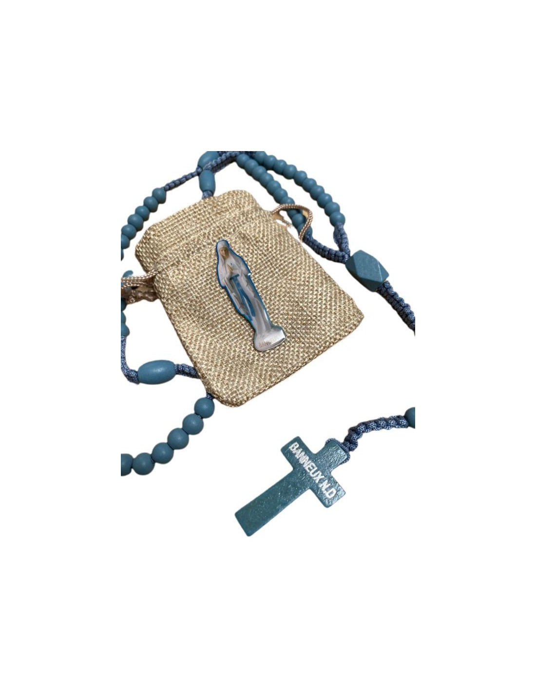 Unser Bestseller! Dieser Rosenkranz aus Banneux wurde vollständig von Hand in der Makramee-Technik hergestellt. Das Holz und der Faden sind in einem sanften Türkisblau gehalten. Der Rosenkranz wird mit einem Täschchen und einem Pin der Jungfrau der Armen geliefert.
