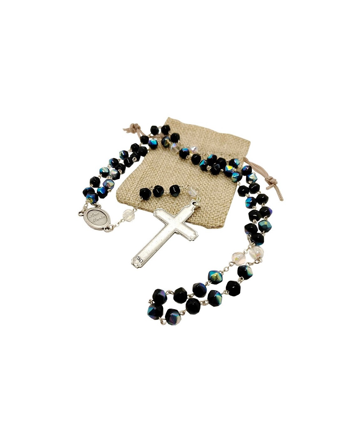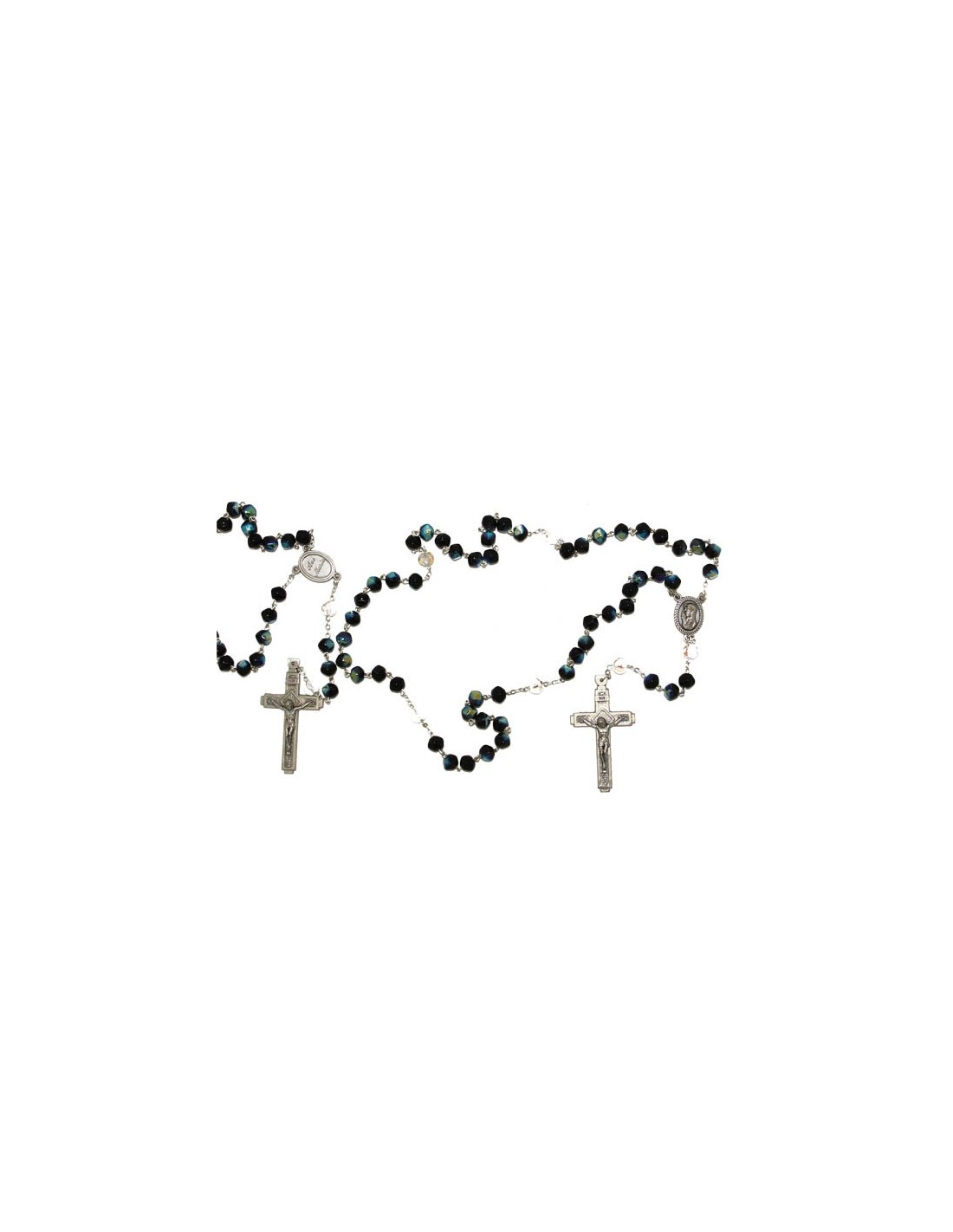 Dieser Rosenkranz mit Glasperlen ist an einer Kette aus versilbertem Metall befestigt. Die meisten Perlen sind tiefschwarz mit blauen Reflexen, einige sind blau schillernd und andere transparent schillernd, fast opalisierend. Das Christuskreuz ist fein ziseliert und verziert, ebenso wie die Medaille mit der Heiligen Jungfrau. Die Medaille ist auf der Rückseite mit einem Ave Maria versehen. Sie ist ein sehr schönes Gebetsmittel.