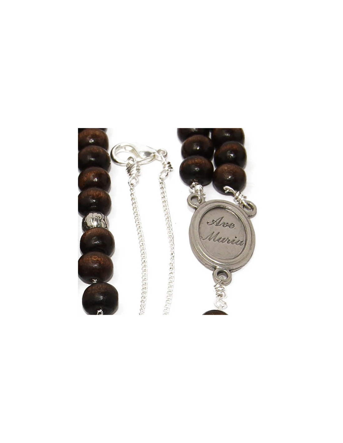 Rosenkranz mit dunkelbraunen Holzperlen, montiert an einer versilberten Metallkette. Dieser Rosenkranz kann als Halskette verwendet werden.
