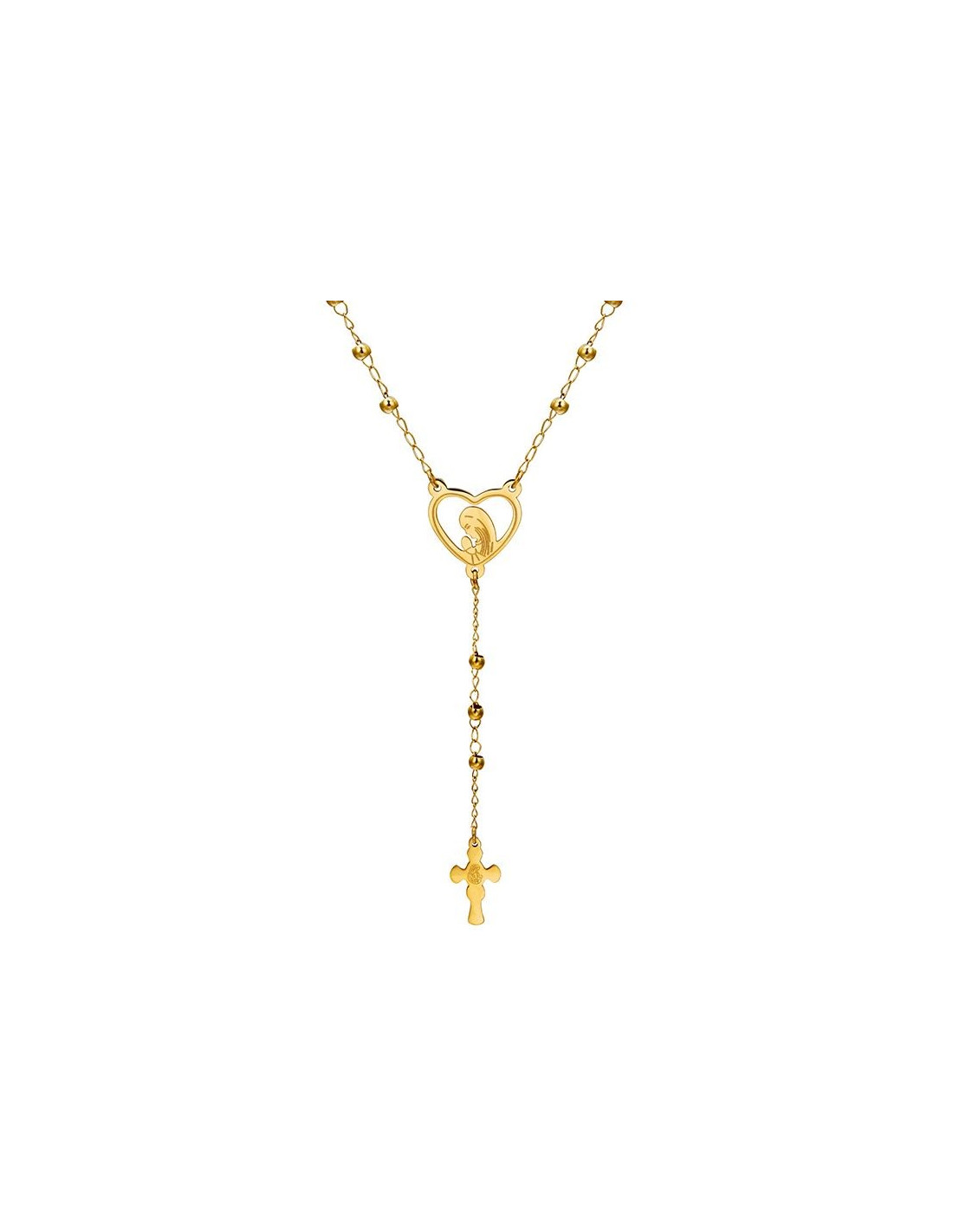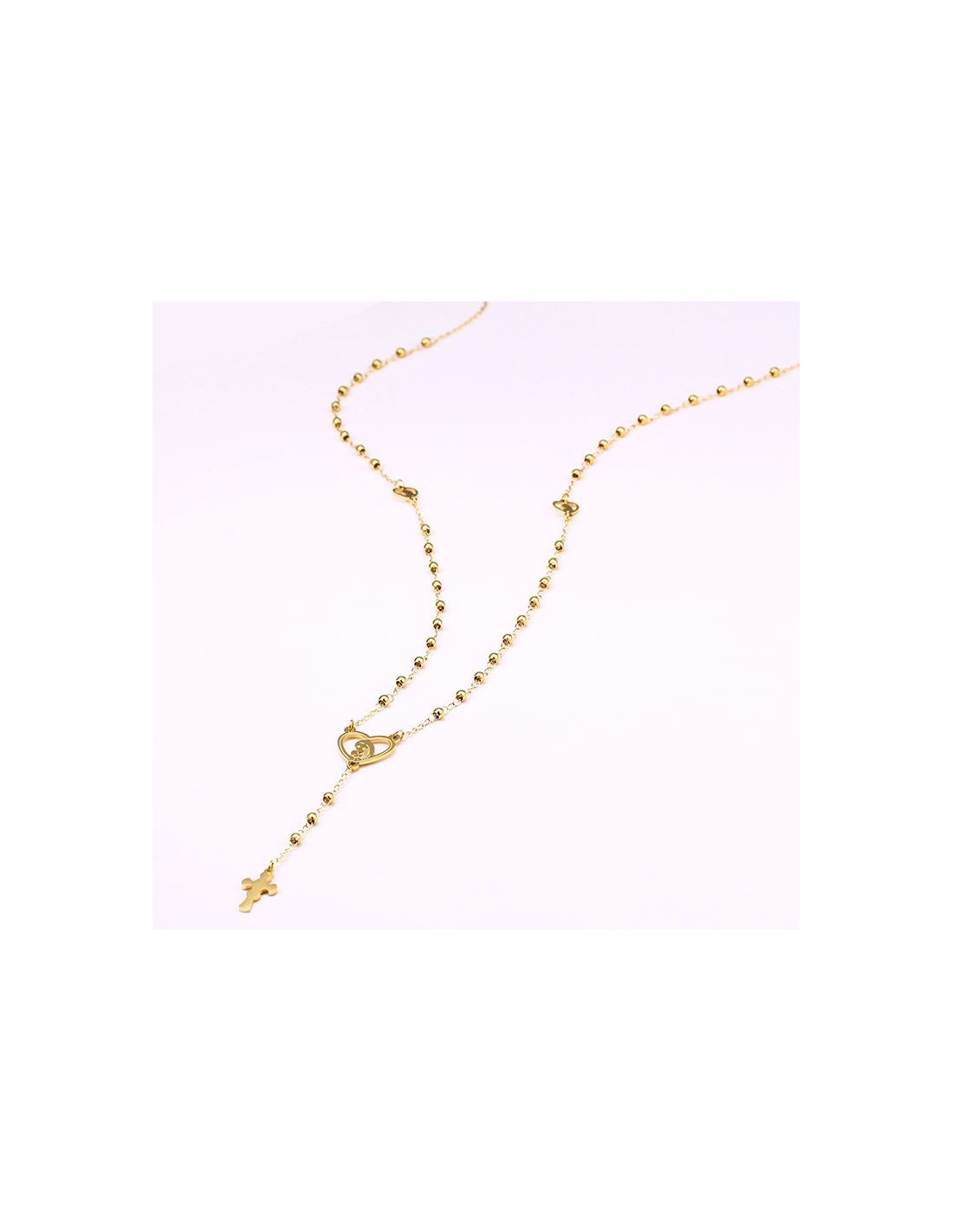 Dieser vergoldete Rosenkranz ist ein dezentes Schmuckstück, das den Glauben still bezeugt und dabei leuchtend und weich wirkt. Der herzförmige Mittelteil zeigt eine Figur, die mit verbundenen Händen betet.