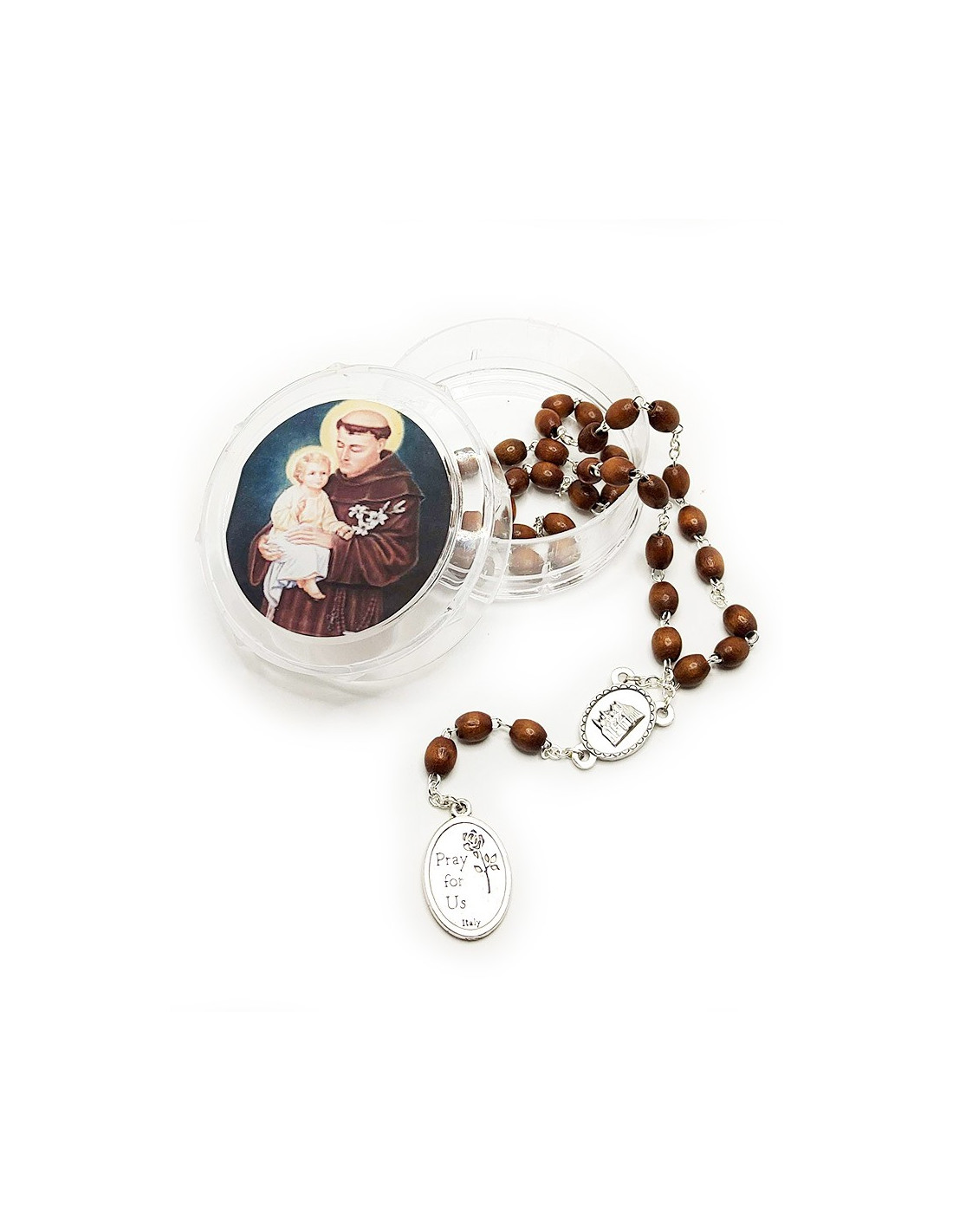 Rosenkranz mit Holzperlen und einer Kette aus versilbertem Metall, der dem Heiligen Antonius von Padua gewidmet ist. Die Medaille zeigt den Heiligen Antonius mit einem "Pray for us" auf der Rückseite und einer Rose. Die mittlere Medaille zeigt die Ikone des Heiligen Antonius mit der Kirche von Padua auf der Rückseite.