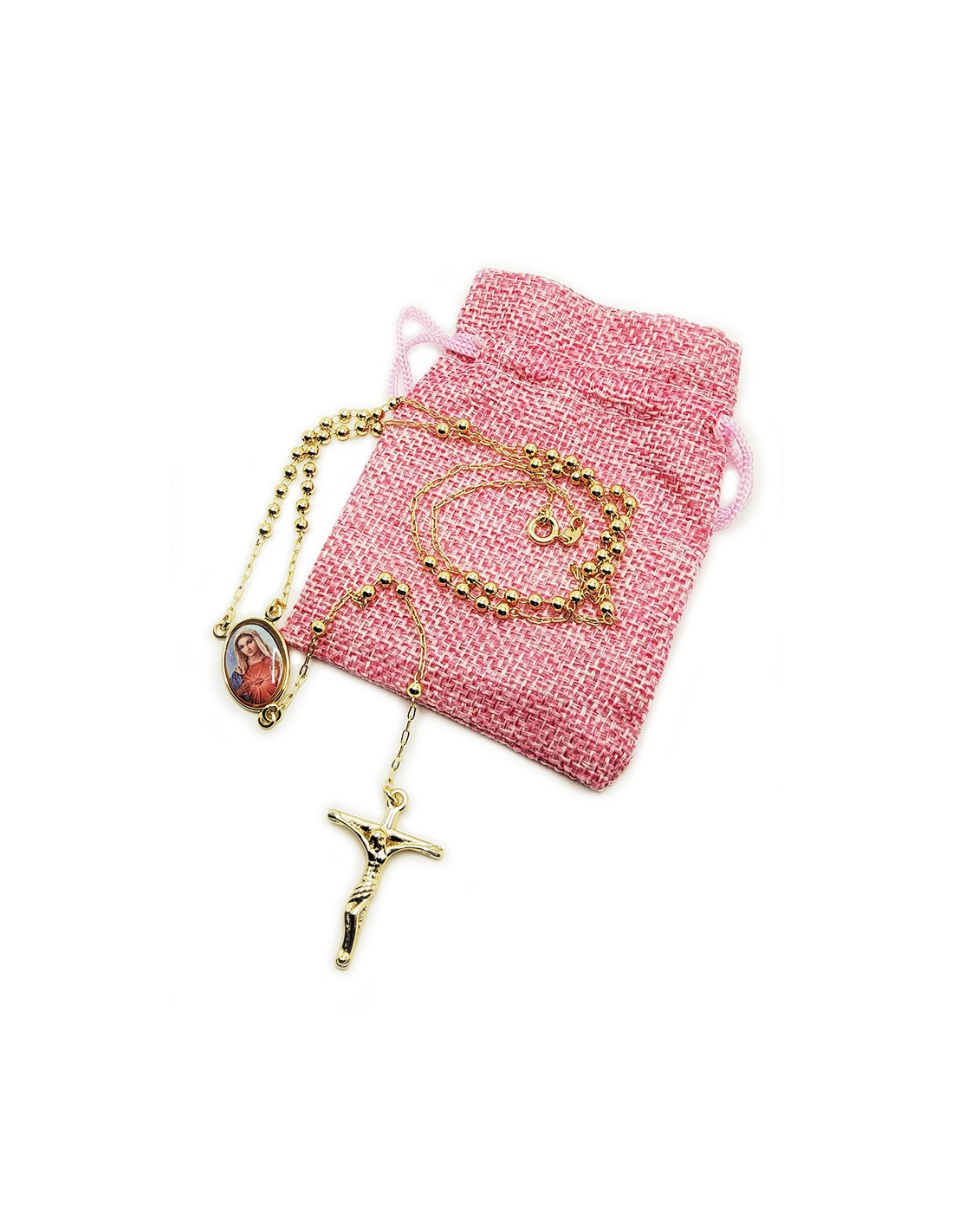 14 Karat vergoldeter Herz-Mariä-Rosenkranz mit Karabinerverschluss, um ihn als Halskette zu befestigen. Die zentrale Herz-Marien-Medaille ist farbig und mit einem Kreuz auf der Rückseite graviert. Wird mit einem Beutel zur Aufbewahrung verkauft.
