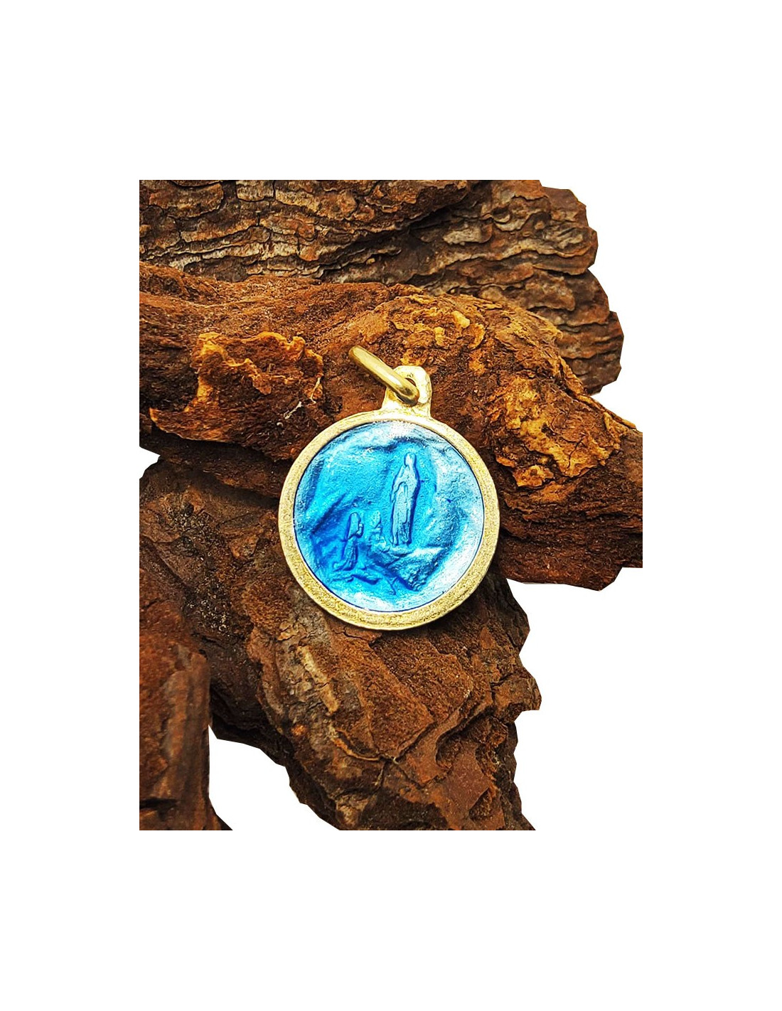 Runde Medaille aus versilbertem Metall und blauem Emaille, ein Schatz des Glaubens und der Frömmigkeit, der speziell für Sie, den Gläubigen, entworfen wurde. Durchdrungen von der mütterlichen Liebe der Heiligen Jungfrau Maria und der Gnade Unserer Lieben Frau von Lourdes ist diese Medaille ein Symbol des Trostes und des Schutzes, das für alle zugänglich ist.