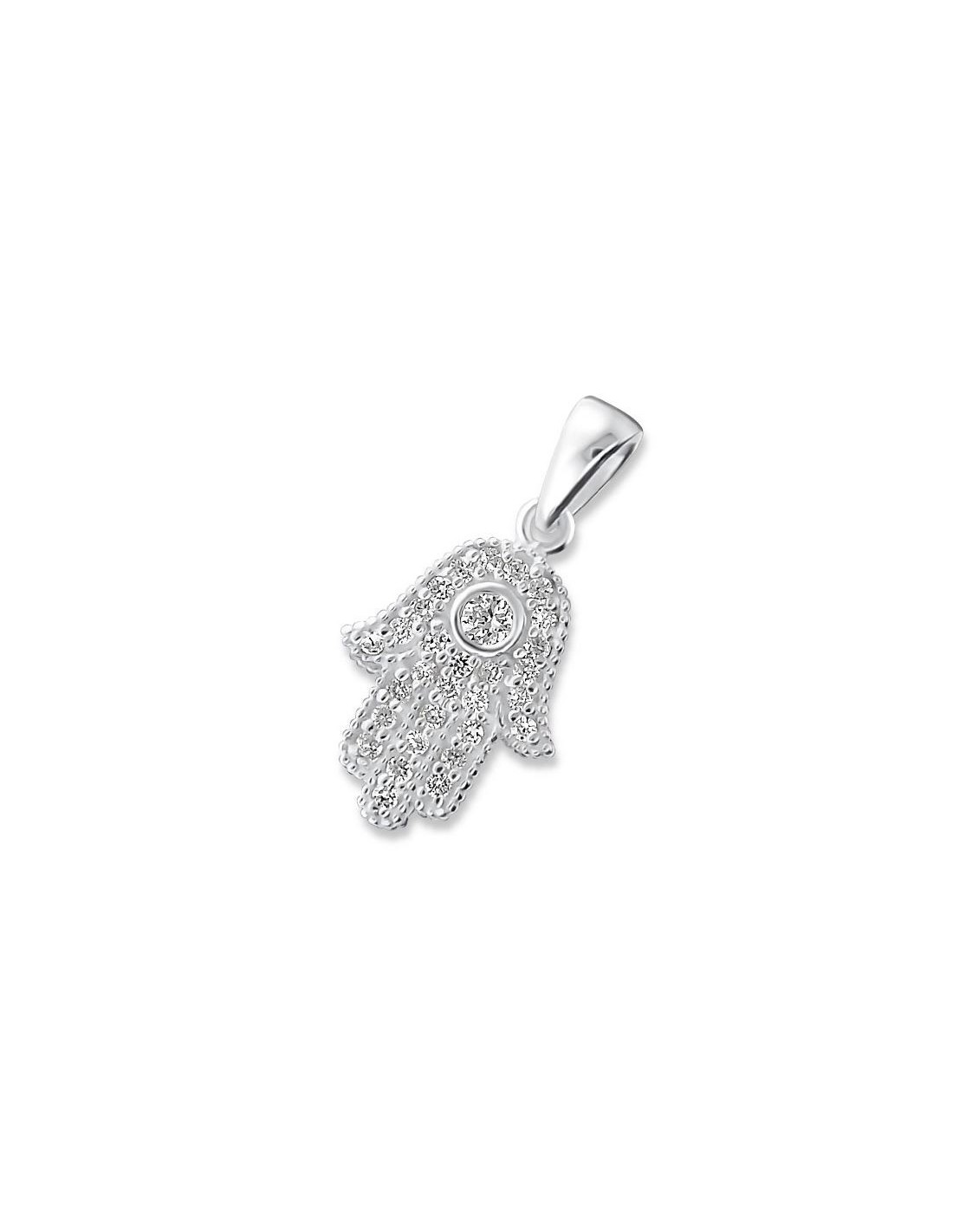 Anhänger aus echtem Silber 925 und eingelegt mit kleinen weißen Kristallen. Es hat die Form der Hand der Fatma, ein im Nahen und Mittleren Osten sehr beliebtes Schutzsymbol. Er wehrt negative Energien und den bösen Blick ab und fördert Glück und Wohlstand.