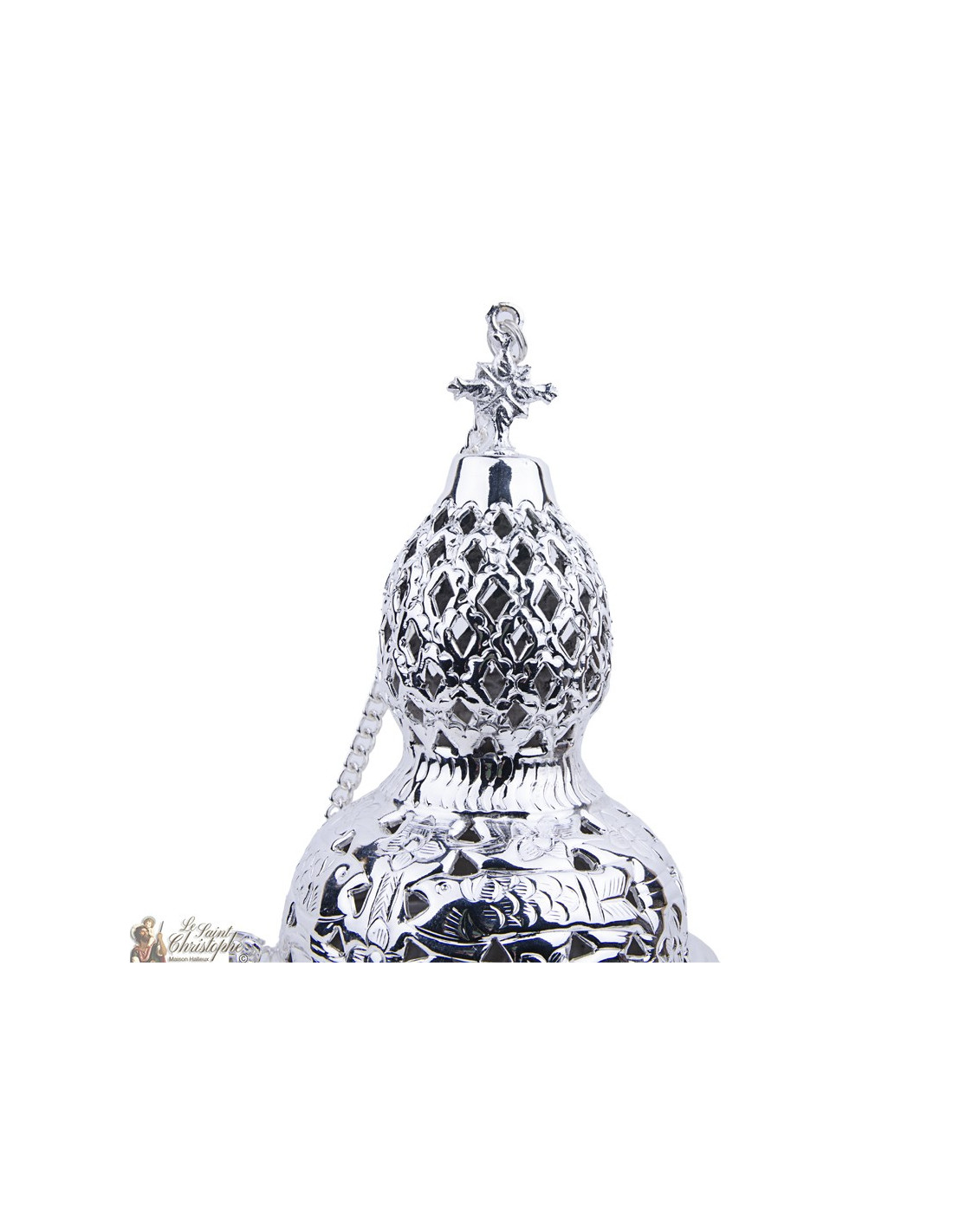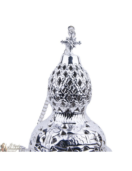 Dieser versilberte, hängende Weihrauchbrenner ist mit einem schönen Pflanzenfries auf der Oberfläche graviert und mit einem reich verzierten Kreuz gekrönt. Der Deckel liegt gut in der Hand, auch dank des Kreuzes und der Hopfenform, die ihn noch größer macht. Die Löcher sind diskret in die weißen Flächen des Frieses geschnitten und verleihen ihm mehr Relief. Das Räuchergefäß enthält auch einen Rost zum Ablegen der Räucherstäbchen und -körner. Die langen Ketten ermöglichen es, ihn aufzuhängen.