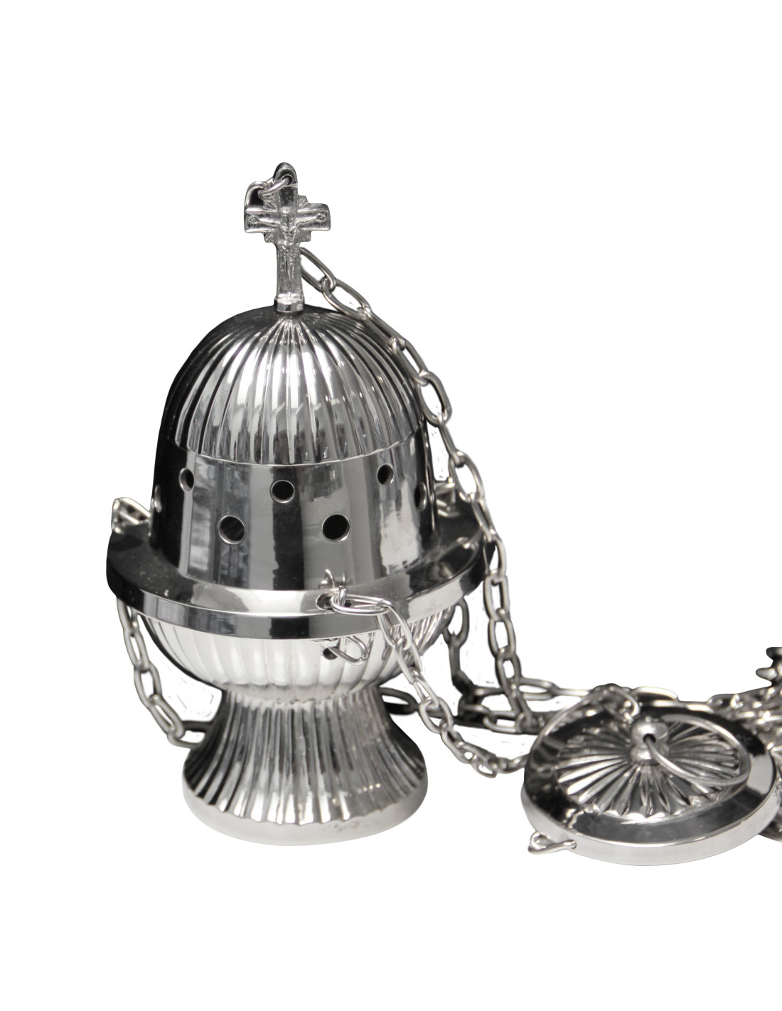 Dieses versilberte Weihrauchfass kann je nach Bedarf aufgehängt oder an die Wand gestellt werden. Ein perfektes Accessoire für religiöse Zeremonien und Feiern wie Messen. Sein schlichtes und geometrisches Design macht ihn zu einem nützlichen und diskreten Objekt. Es ist mit einem Kreuz geschmückt, einem fein ziselierten Element, auf dem sich die Christusfigur befindet. Dieser Artikel wurde von Hand bearbeitet.