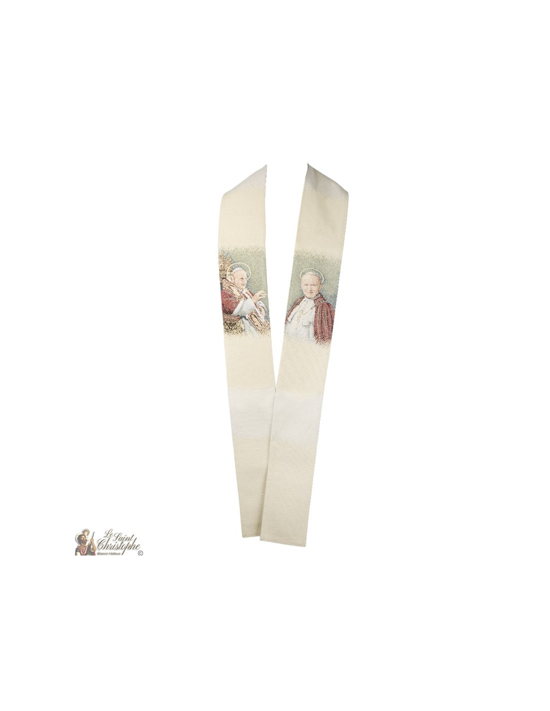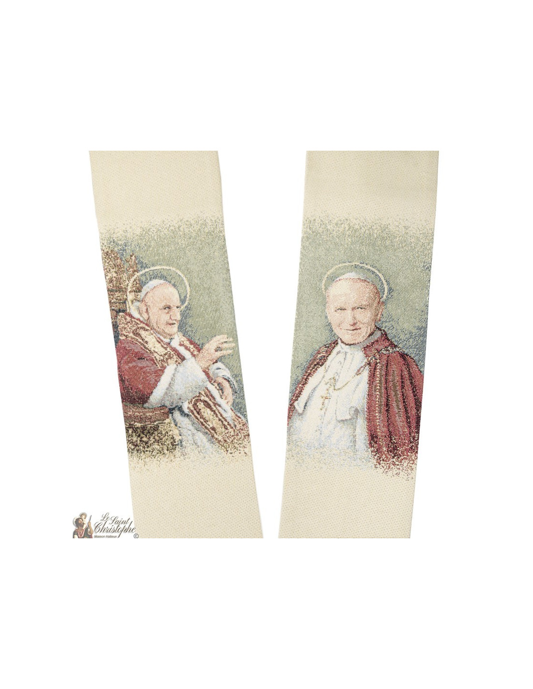 Diese Priesterstola ist mit den Abbildungen der Päpste Johannes XXIII. und Johannes Paul II. gewebt. Der cremebeige Hintergrund ist ein zarter Farbverlauf. Die Webart ist eine echte Tapisserie-Stickerei mit einer bewundernswerten Verarbeitung, inspiriert von den Brügger Wandteppichen.