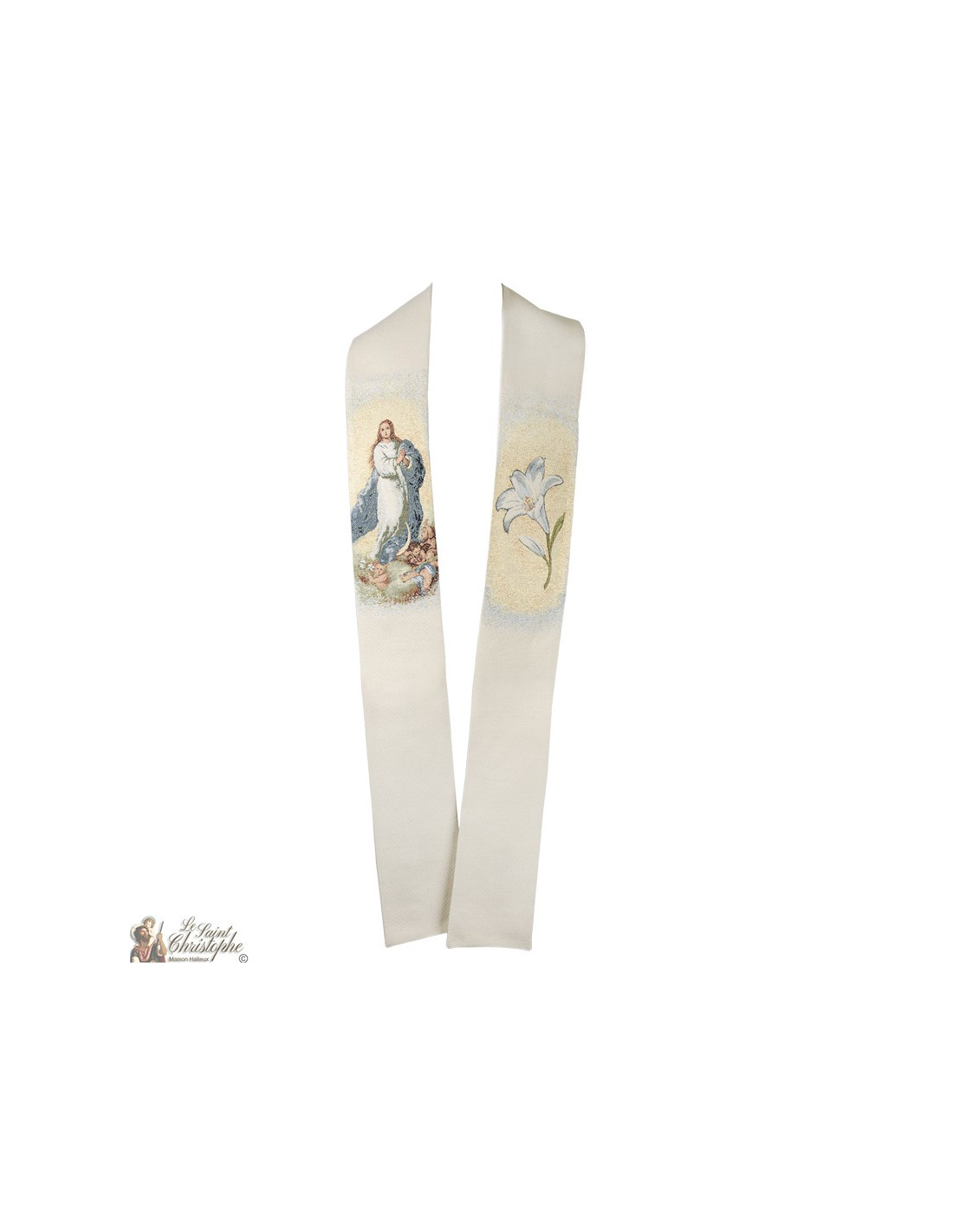Diese Priesterstola ist mit der Figur der Jungfrau Maria Himmelfahrt und einer weißen Lilie gewebt. Der cremebeige Hintergrund ist ein zarter Farbverlauf. Die Webart ist eine echte Tapisserie-Stickerei mit einer bewundernswerten Verarbeitung, die von den Brügger Wandteppichen inspiriert wurde.