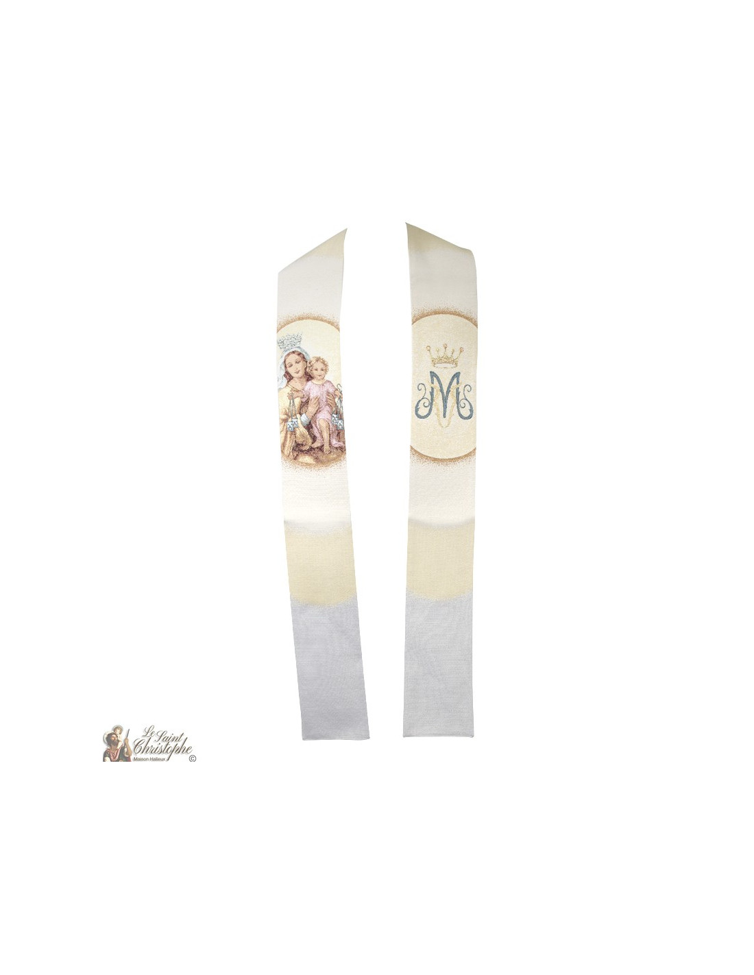 Diese Priesterstola ist mit der Madonna des Skapuliers und dem Mariensymbol mit schönen Arabesken gewebt. Der beigefarbene Hintergrund ist ein zarter Farbverlauf. Die Webart ist eine echte Tapisserie-Stickerei mit einer bewundernswerten Verarbeitung, die von den Brügger Wandteppichen inspiriert wurde.