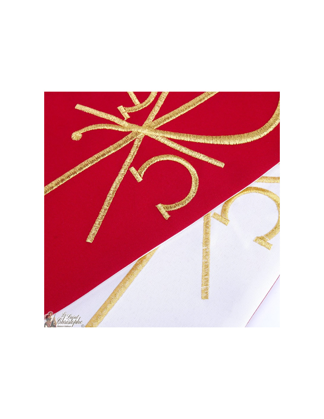 Zweifarbige und bestickte Priesterstola. Eine Seite ist rot, die andere weiß. Die vier Seiten sind mit goldenem Garn mit dem PAX-Symbol Alpha und Omega bestickt.
