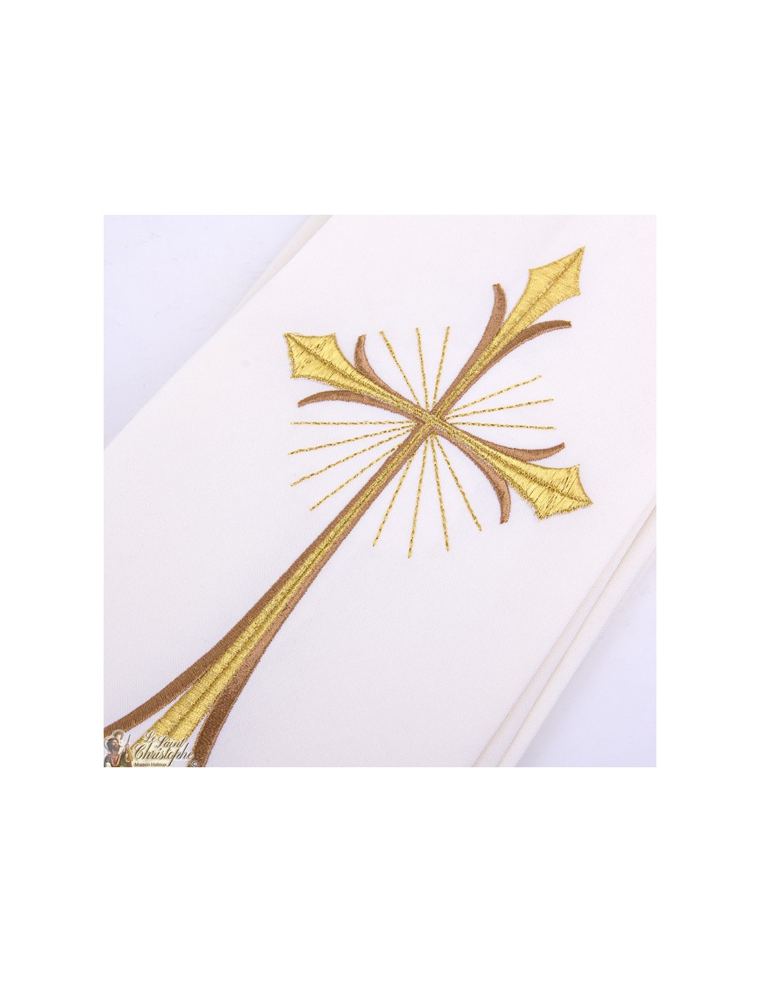 Cremeweiße, bestickte Stola für Priester. Die Stola wurde vollständig von Hand gefertigt, ist pflegeleicht und maschinenwaschbar. Die Stickerei aus goldenen und kupferbraunen Fäden stellt ein ausladendes, sehr elegantes Kreuz dar, das von Lichtstrahlen umgeben ist.