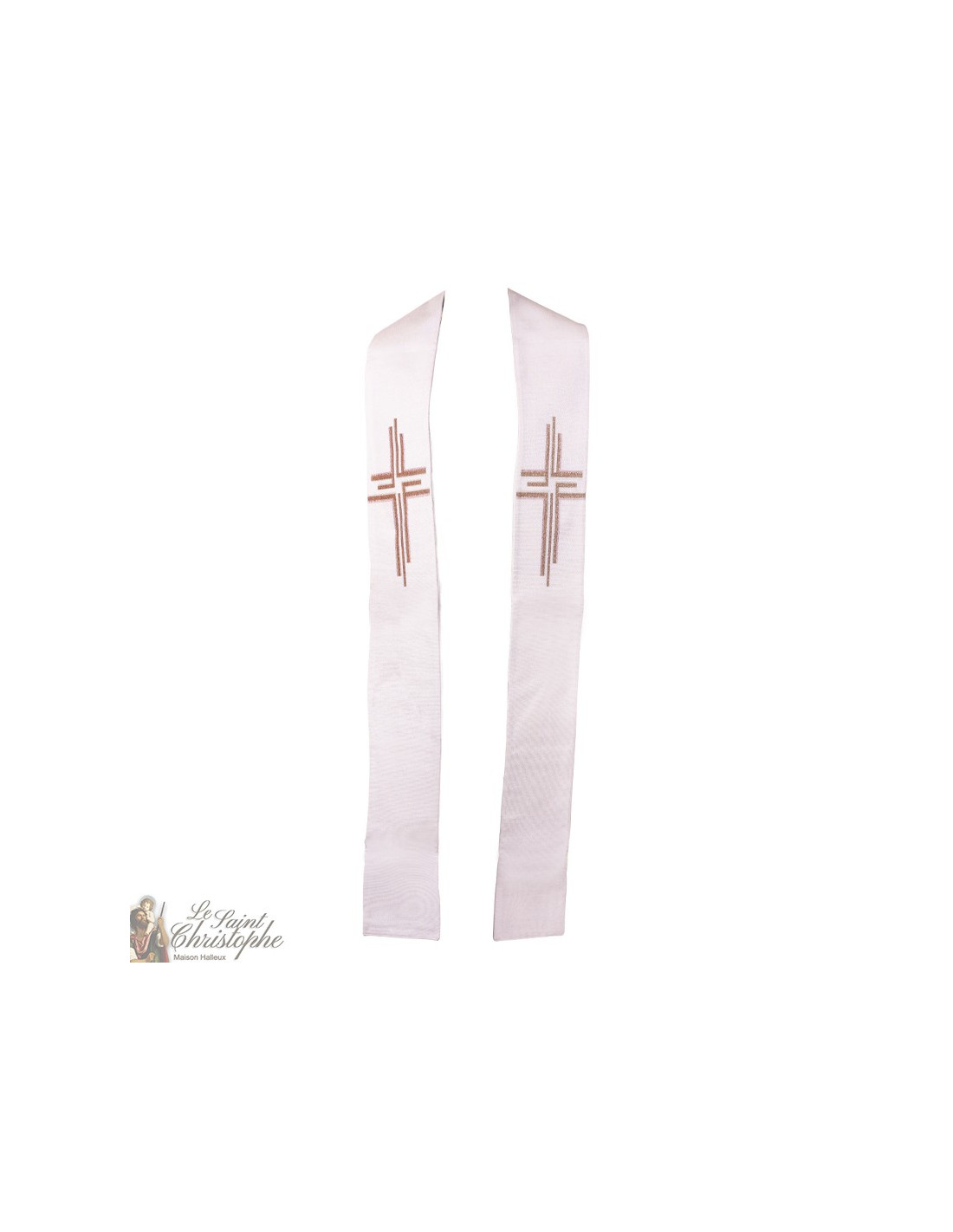 Cremeweiße Priesterstola, bestickt mit einem kupfer- und goldfarbenen Kreuz im modernen Stil. Die Stickerei ist eine Gobelin-Gobelin-Stickerei mit einer ausgezeichneten Verarbeitung. Die Stola ist maschinenwaschbar.