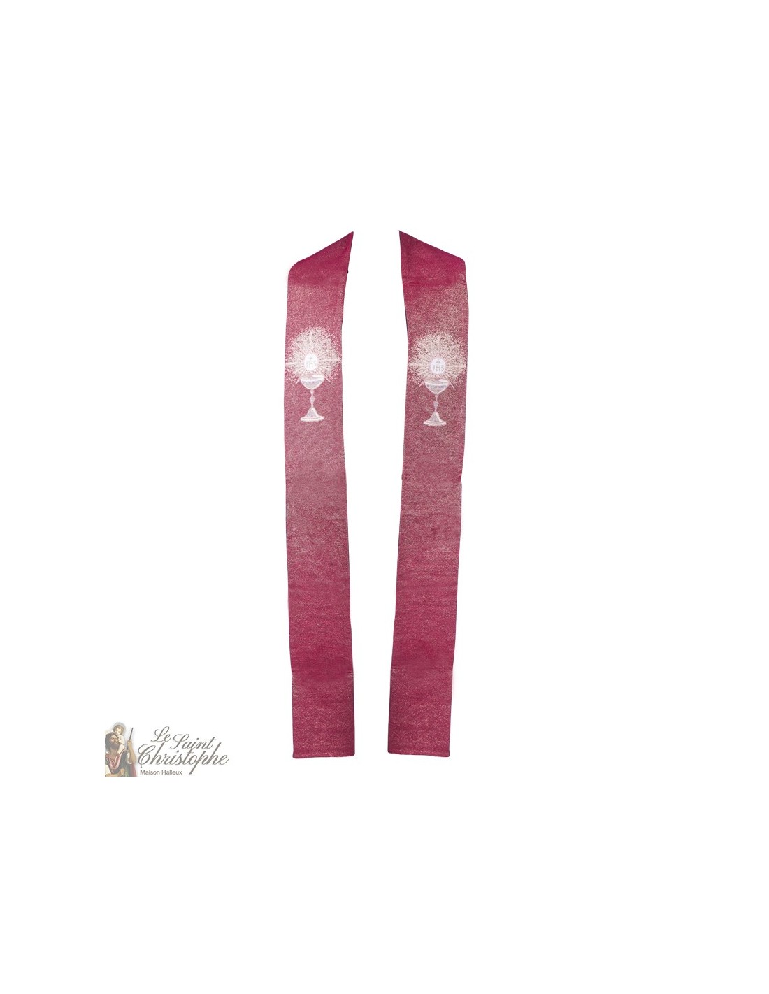 Priesterstola, rot und bestickt mit einem weißen Kelch, über dem die heilige Hostie thront, die ein fein gearbeitetes göttliches Licht ausstrahlt. Die Stickerei ist eine Gobelin-Gobelin-Stickerei mit einer ausgezeichneten Verarbeitung. Die Stola ist maschinenwaschbar.
