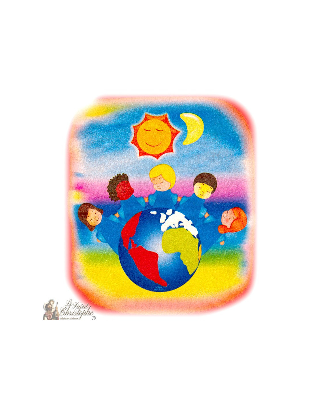 Rosa T-Shirt mit einem Motiv der Erde, umgeben von den Kindern der Welt. Erhältlich in zwei Größen: 3-4 Jahre (105 cm) und 5-6 Jahre (115 cm).