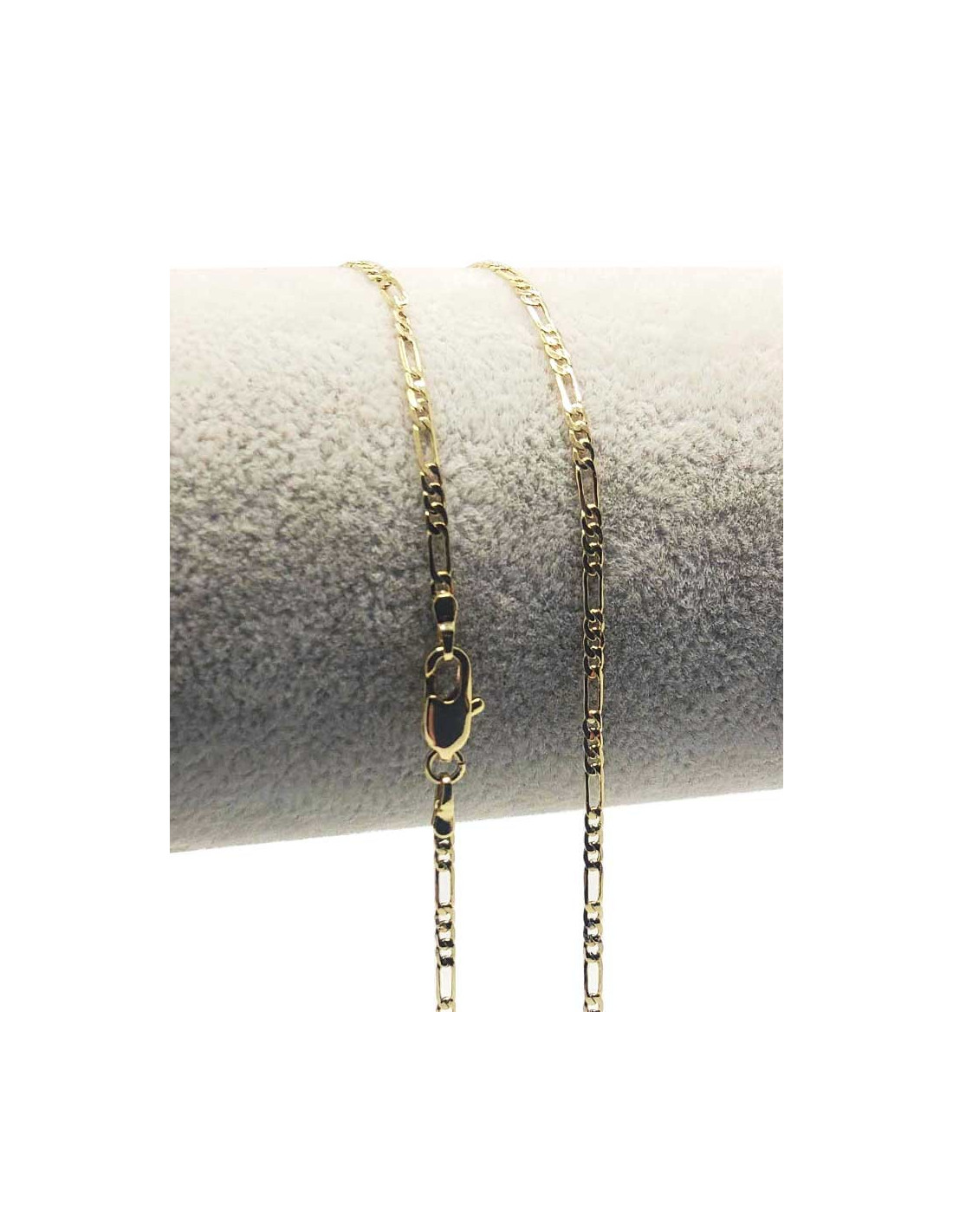 Feine Figarokette, 49 cm lang, aus 14k goldplattiertem Kupfer. Figaroketten erkennt man an ihren unterschiedlich großen Gliedern, einer Abfolge von einem langen Glied für drei kurze Glieder. Ein asymmetrisches Design für einen modernen Stil.