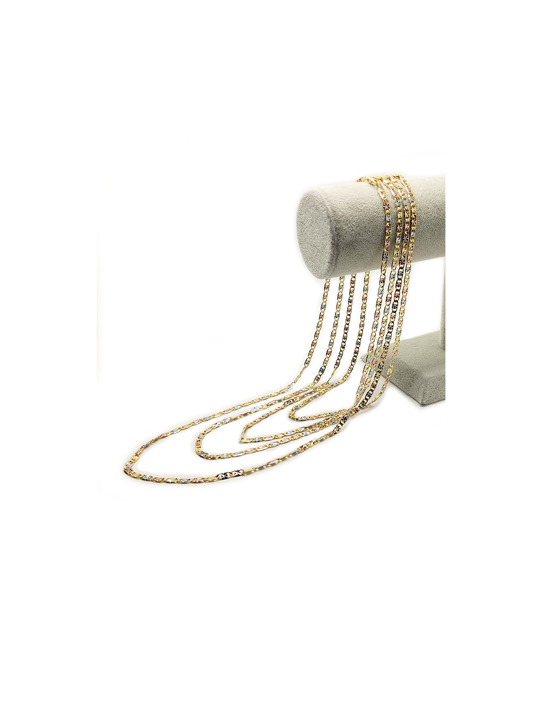 Verleihen Sie Ihrem Stil einen Hauch von Luxus und Eleganz mit dieser wunderschönen laminierten Kette mit dreifarbigem Muster aus vergoldetem Edelstahl. Diese strahlende und raffinierte Kette wurde entwickelt, um einen dauerhaften Glanz zu bieten und dem Anlaufen zu widerstehen. Sie ist ein zeitloses Schmuckstück, das sich all Ihren Wünschen anpasst. Dank ihrer Qualität ist sie sogar wasserfest und verblasst nicht. Die Glieder sind in einem abwechselnden Muster aus Silber, Gold und Roségold angeordnet und sorgen für einen wunderschönen Glanzeffekt.