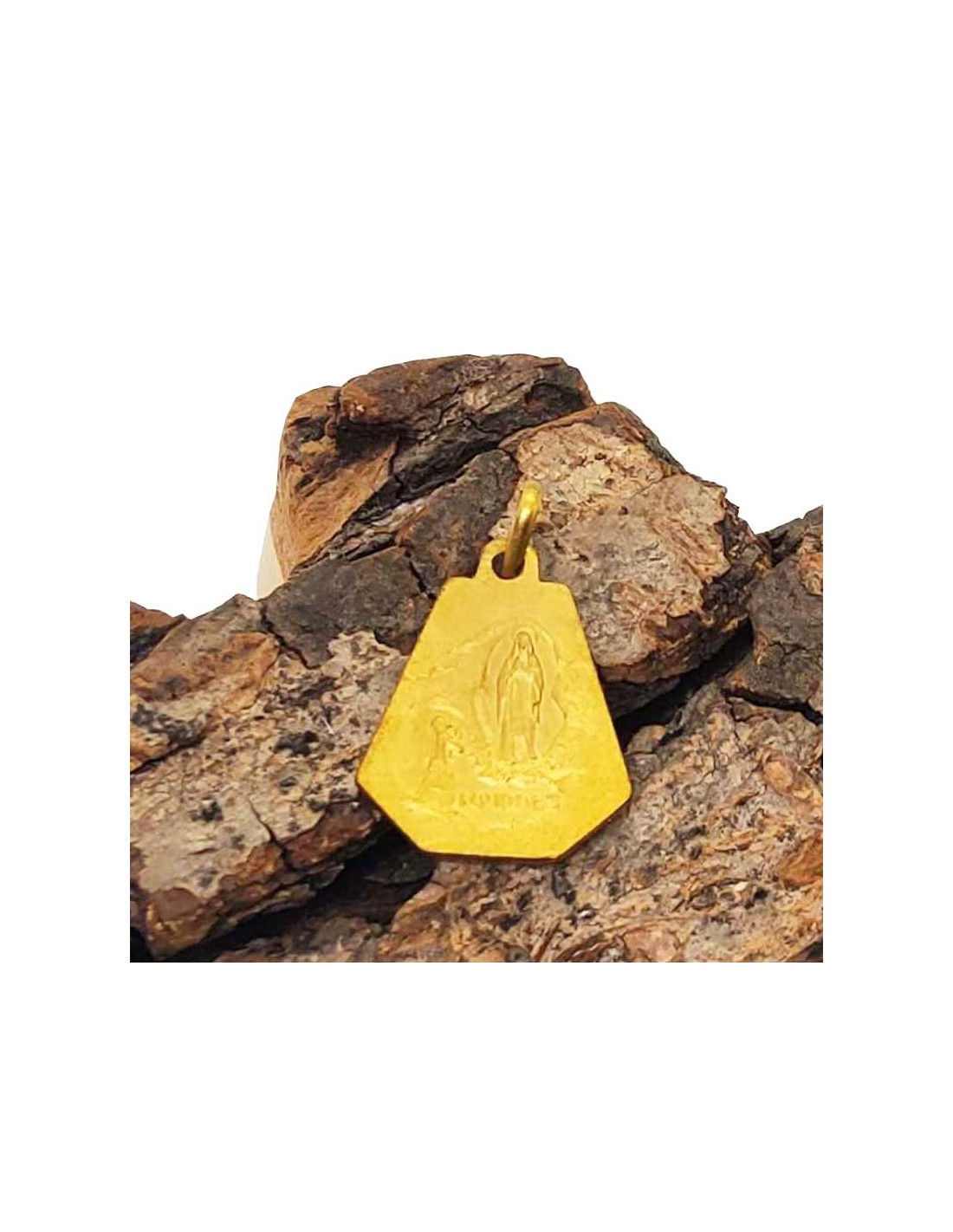 Medaille mit dem Porträt der Heiligen Jungfrau Maria mit Heiligenschein, vergoldet. Die Rückseite zeigt das Bild der Erscheinung Unserer Lieben Frau von Lourdes. Dieser Anhänger ist ein wunderschönes Schmuckstück, eine religiöse Medaille, die unter allen Umständen getragen werden kann. Sie ist wie eine tröstende Gegenwart der Jungfrau, wie sie es für Bernadette Soubirous war.