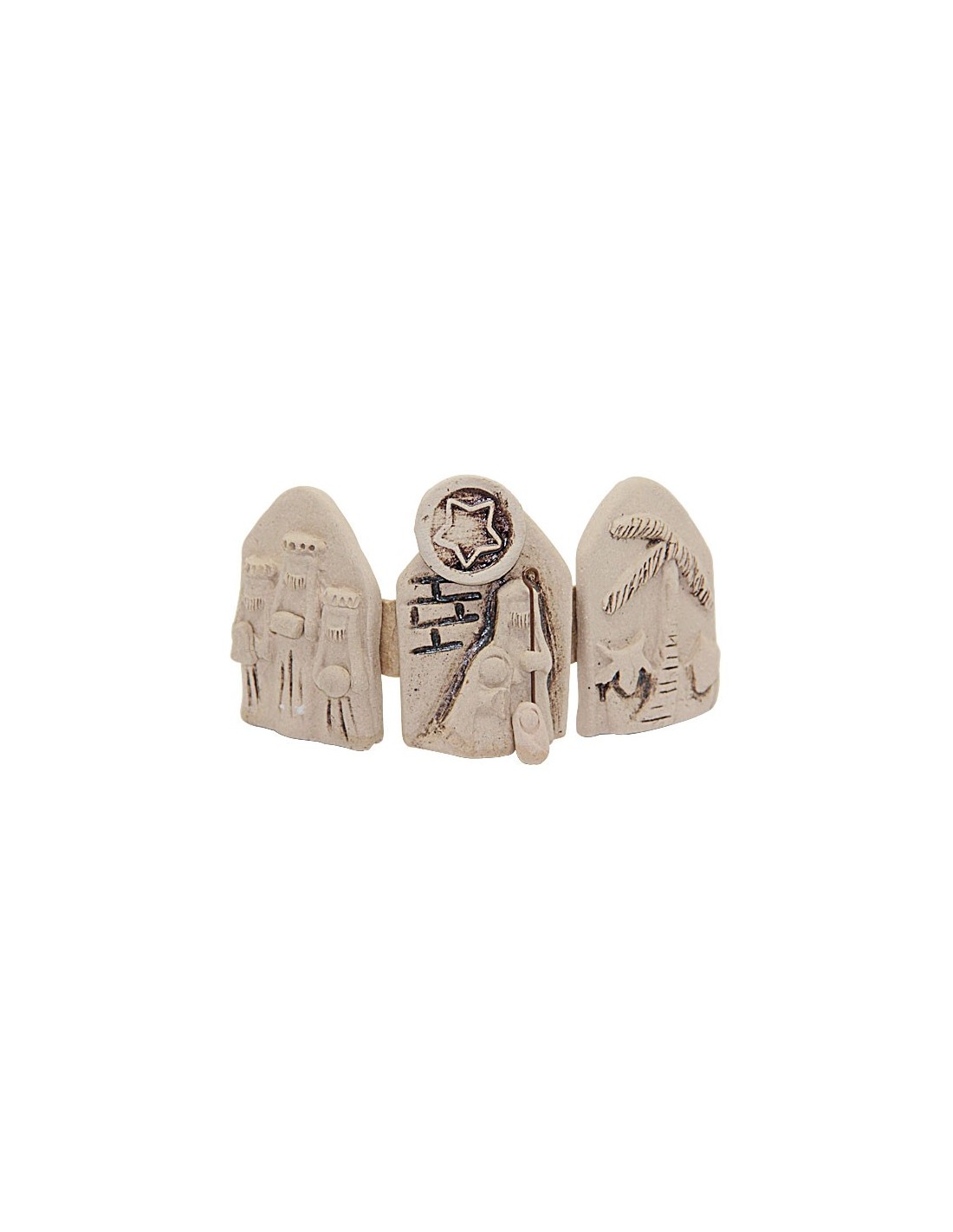 Verleihen Sie Ihrem Zuhause mit dieser dreiteiligen Weihnachtskrippe aus Terrakotta einen Hauch von Originalität. Jedes Stück wurde von einem Kunsthandwerker aus Venezuela hergestellt und ist ein Unikat, ein kleines Kunstwerk aus der Welt des Kunsthandwerks, das sich leicht in Ihr Zuhause integrieren lässt. Das Triptychon zeigt das Jesuskind, die Jungfrau Maria und den Heiligen Josef, überragt von einem Stern in der Mitte, den drei Heiligen Drei Königen auf der linken Seite und einer Wüstenszene auf der rechten Seite. Die cremefarbene Terrakotta wird durch einige schwarze Details und einen Metallstab als Symbol für Josefs Stab ergänzt.