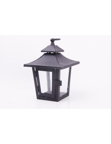 Schwarze Laterne aus Schmiedeeisen im klassischen und schlichten Stil. Im Inneren kann eine Kerze vom Typ Teelicht (auch Tealight genannt) aufgestellt werden. An der Spitze befindet sich ein Ring, an dem die Laterne aufgehängt werden kann.